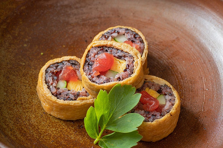ポリフェノールが豊富な紫黒米の黒シャリを油揚げで巻いて、彩りのよい巻きずしにしました。