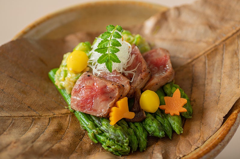 朝採りのアスパラガスと口どけ柔らかな和牛を、栗を練りこんだ木の実味噌で朴葉焼きにしました。秋の味覚の吹き寄せ盛りです。
