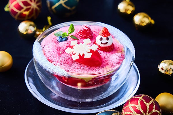 苺でできたサンタクロースに思わず笑みがこぼれる可愛らしいパルフェはショートケーキをイメージしました。フレッシュの苺やブルーベリーとジェノワーズやシャンティ、ピスタチオのクリームなどを重ねた綺麗な層を目でも楽しみながら一緒にお召し上がりください。苺のアイスクリームの上にフランボワーズの泡をのせて仕上げました。クリスマス気分満載のパルフェをぜひご堪能ください。