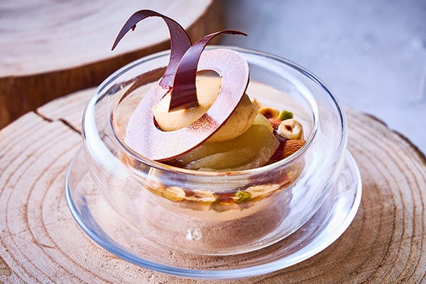 深まった秋に相応しいナッツやキャラメルのコクを感じられる逸品。洋梨のコンポートと紅茶のゼリー、ショコラクリームを一緒に味わいながら散りばめられたナッツの香ばしさとともにお楽しみください。