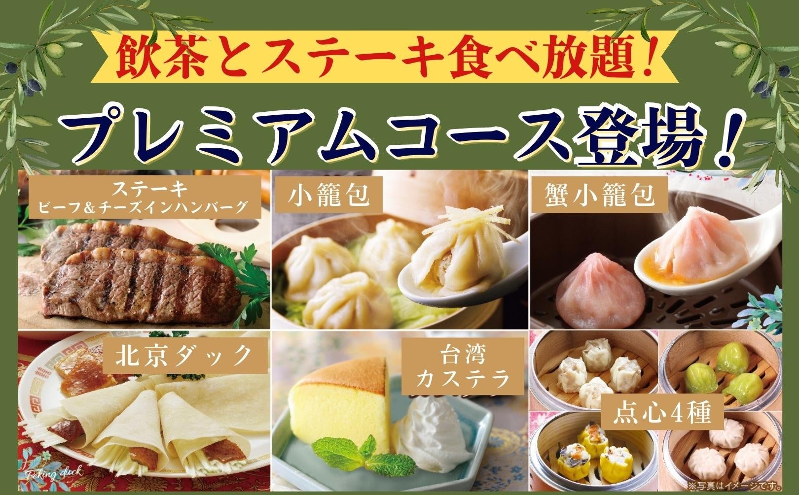 ●プレミアムコース:ブッフェ料理 + ベジフル&ドリンクバー + 飲茶8種 + 肉料理2種(熟成牛赤身ログステーキ・チーズインハンバーグ)