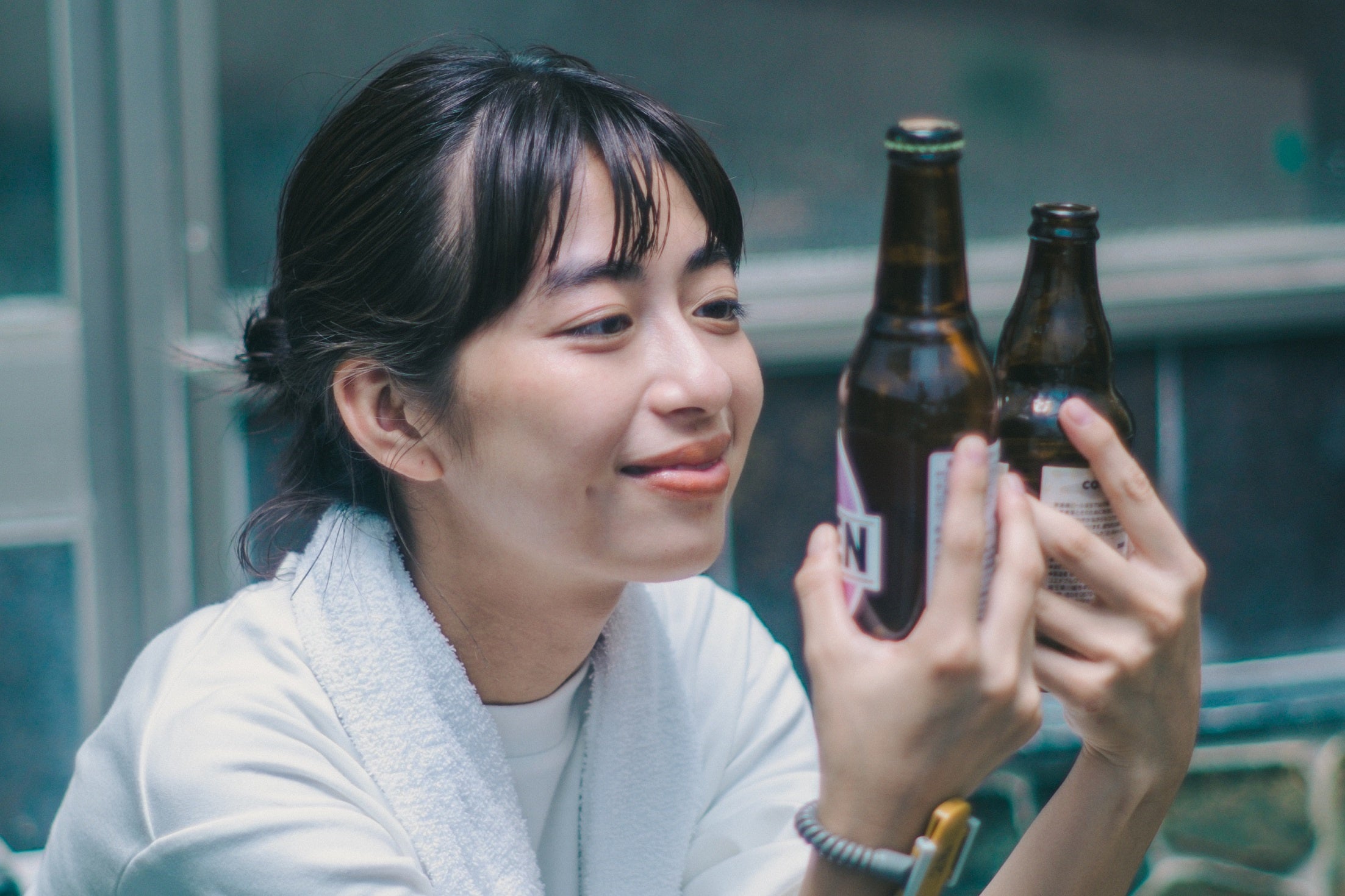 今日もととのった〜!のあとはビール。ホカホカの体、秋の夜風にあたって、ガラスびんで飲む心地よい口当たりのビールは、風情も相まって極上の気分。