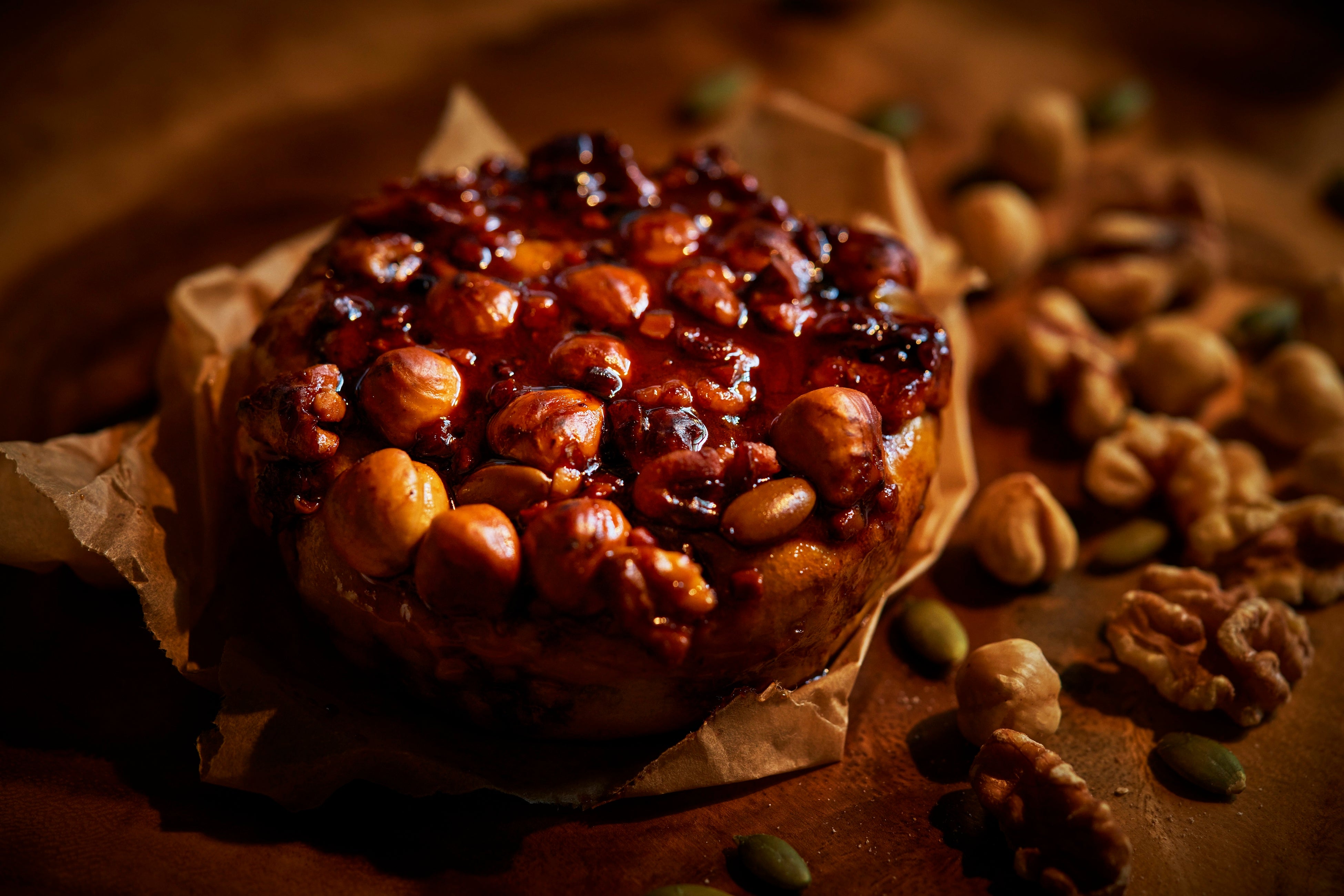 かぼちゃのペーストを練り込んだしっとりした生地にパンプキンシードを乗せ焼き上げ、仕上げにメープルシロップを染み込ませました。アクセントにくるみを使用しています。