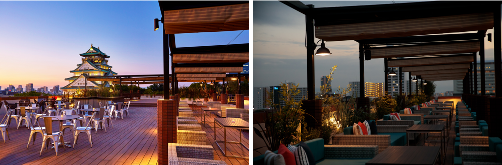 最上階に位置するブルーバーズ ルーフトップテラス。すぐ目の前に大阪城を望む、大迫力の景色を楽しむことができるレストランです。春~秋の季節限定でBBQをご満喫いただけます。