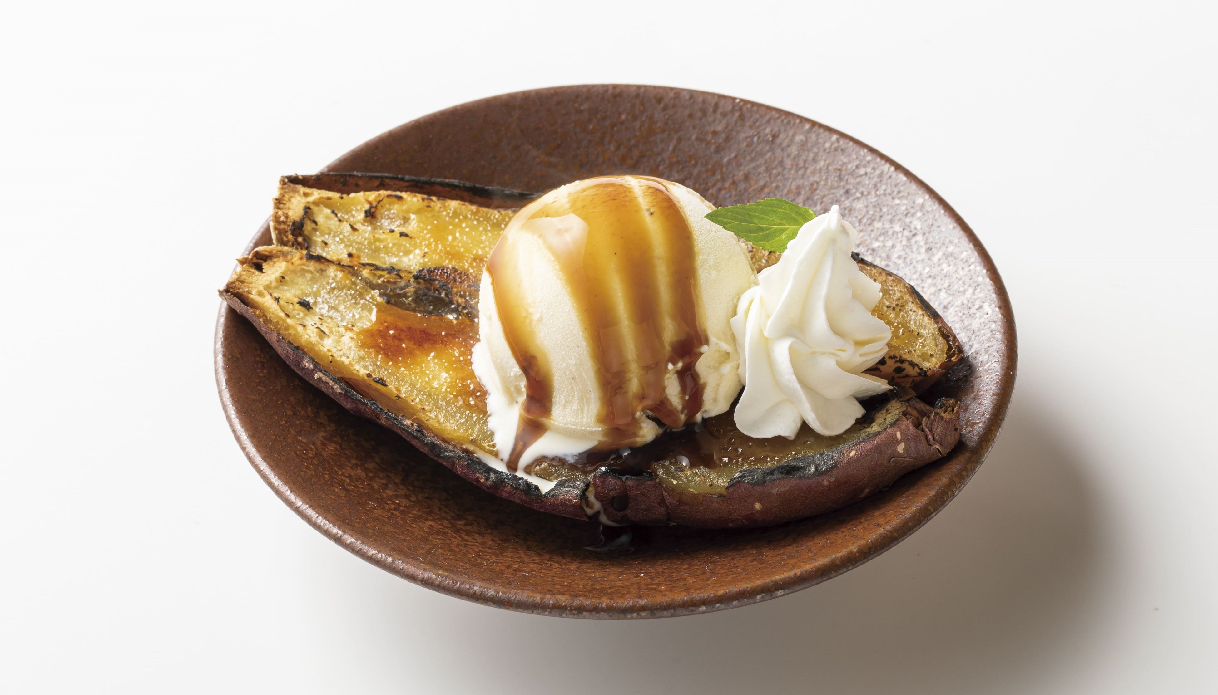 焼きいものほっくりとした断面をパリッとキャラメリゼして、食感も楽しい季節のデザートに仕上げました。バニラアイスとともに、ほぐしてお召し上がりください。