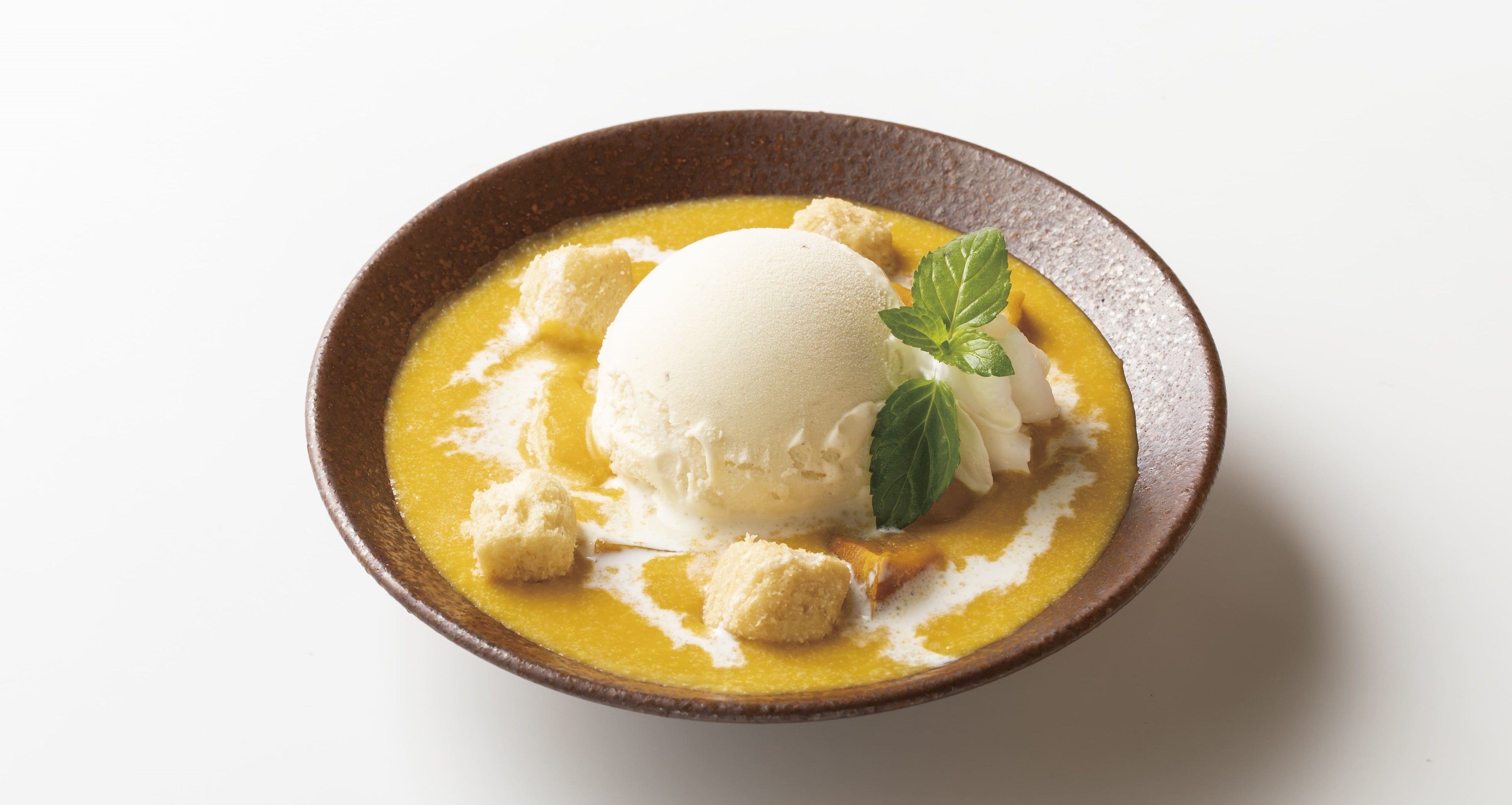 こっくりと熟したかぼちゃの冷製スープとバニラアイスのデザートです。しっとりとした角切りかぼちゃやクルトンを浮かべ、野菜の素材感も楽しんでいただけます。