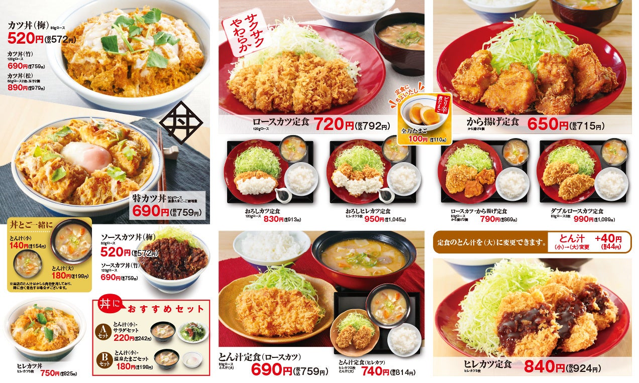定番メニューの「カツ丼(梅)80gロース」は520円(税込572円)。定⾷メニューで⼈気の、サクサクな⾐とやわらかなお⾁を味わえる「ロースカツ定⾷ 120gロース」は720円(税込792円)と、お⼿頃価格で「とんかつ」をお楽しみいただけます。