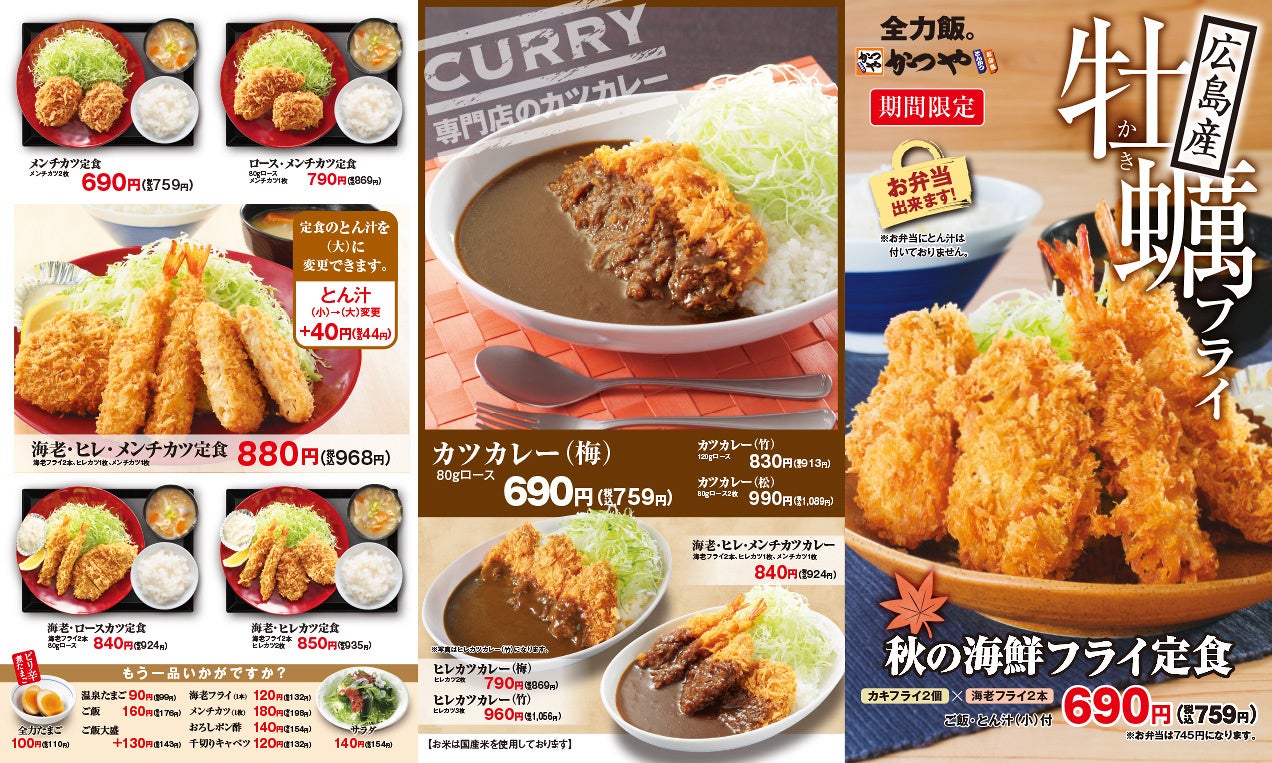 また、いつものカツ丼とご一緒に、牡蠣フライや海老フライで秋を頬張りたい方に向けて、秋の海鮮フライ単品をご用意いたしました。