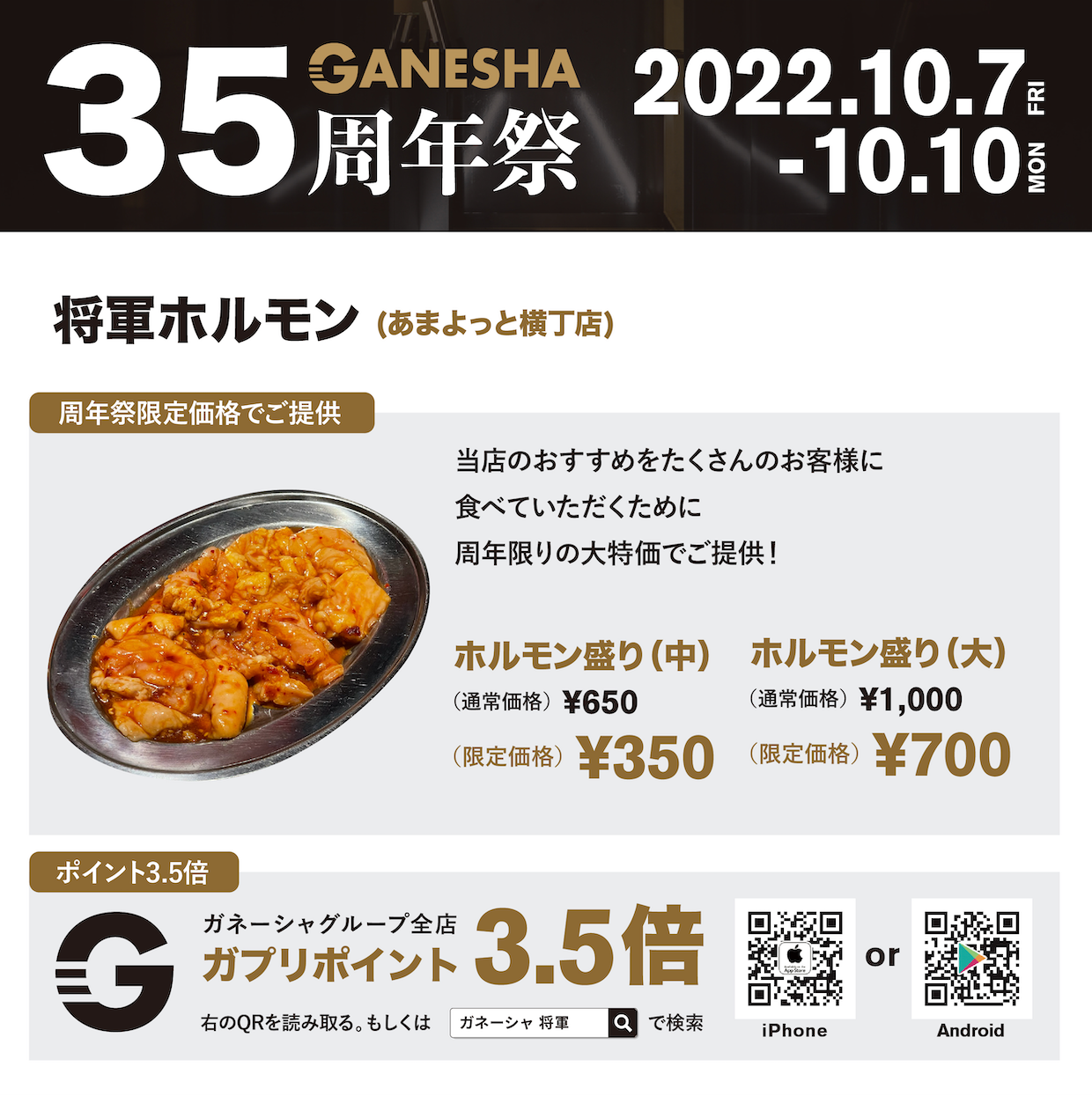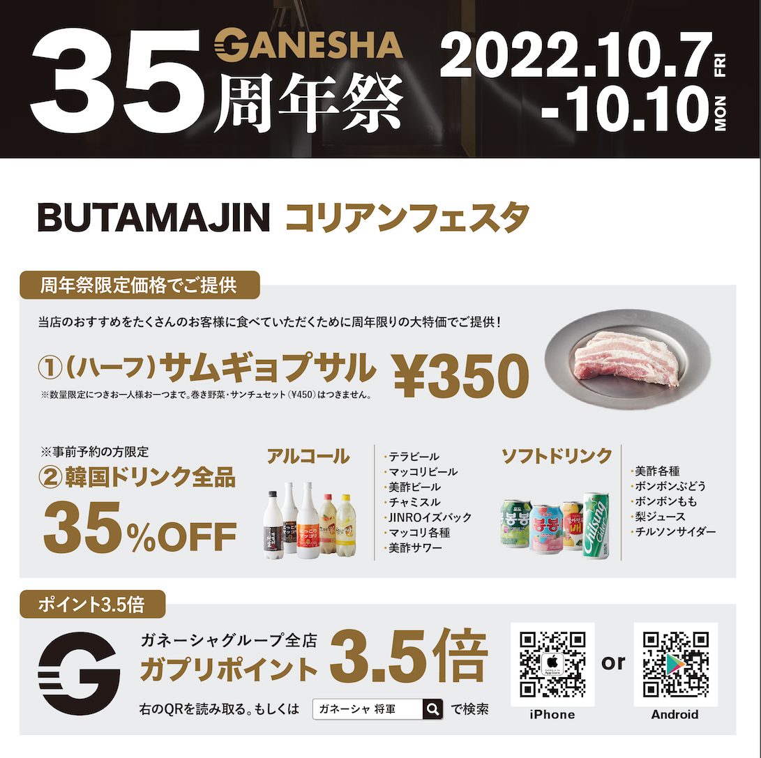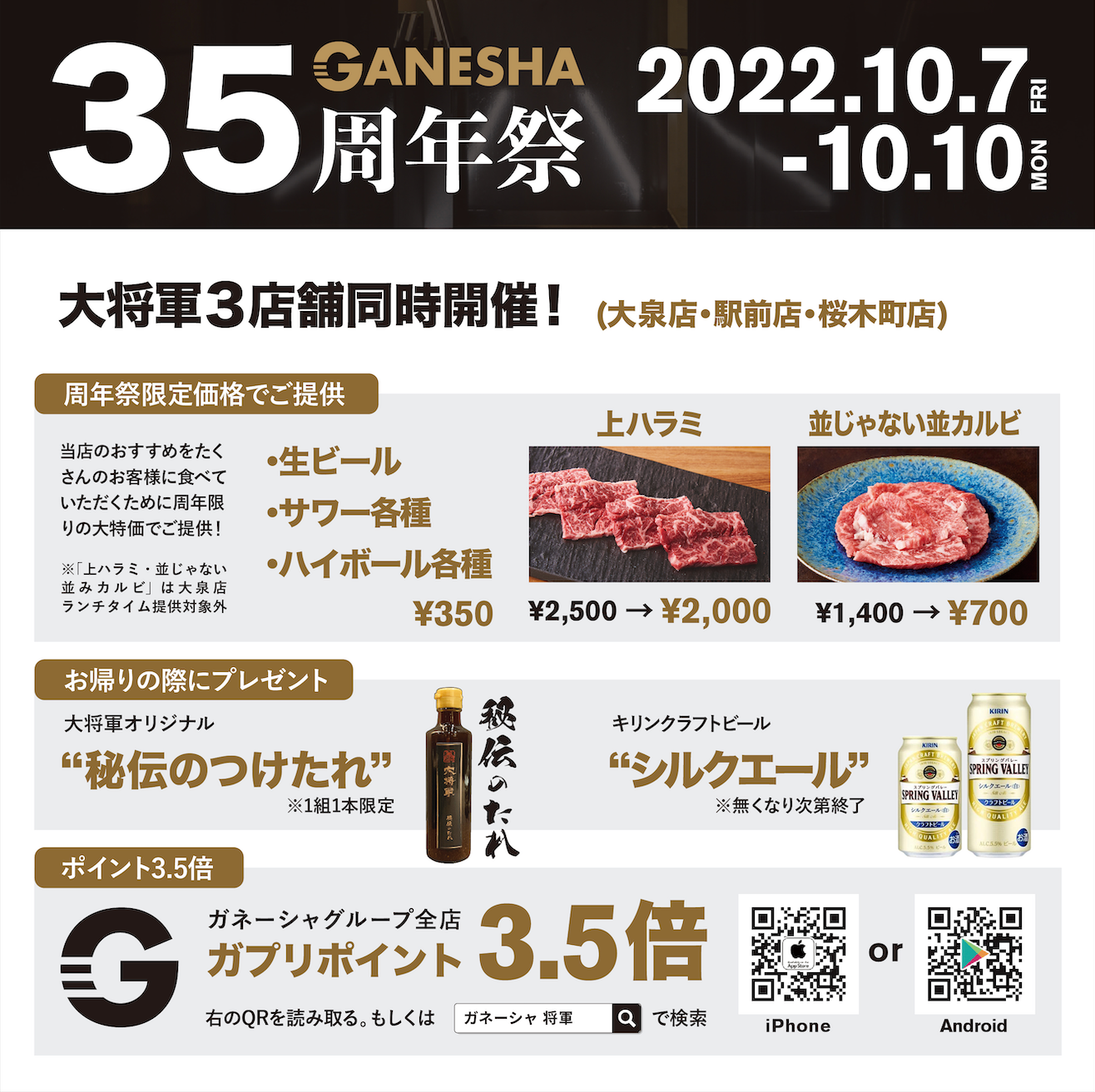 「株式会社 ガネーシャ」 本社:富山県富山市、代表取締役:本田大輝は、10/7-10/10 の4日間、この度創業35周年を迎えられた感謝をみなさまにお伝えするべく全店舗にて周年祭を開催します。【URL】https://ganesha-inc.net