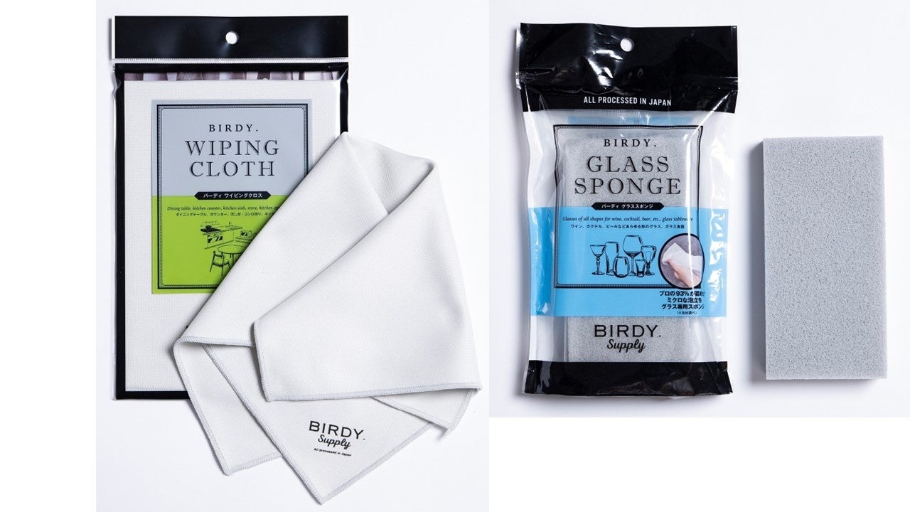 飲食業界のプロにも人気、カクテルシェイカーやワイン用デキャンタなどで世界にその名を轟かせる「BIRDY. Supply」より一度使うと手放せなくなるワイピングクロス(1,980円)とグラススポンジ(990円)がエル・グルメとセットになって発売!