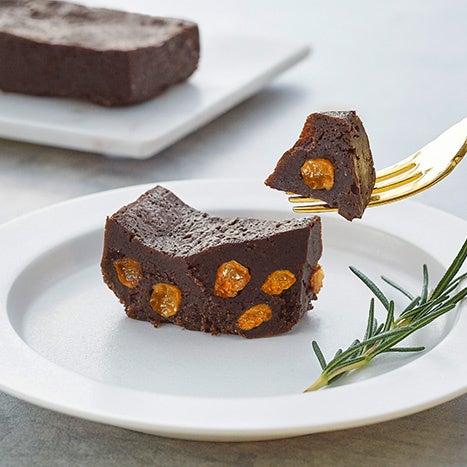 テリーヌ生地にはラムレーズンを贅沢に使用し、チョコレートの比率にこだわ り何度も試作を重ねました。焼成はじっくりと時間をかけて行い、中までしっ とり濃厚な生地に焼きあげ、ラムレーズンの香りも一緒にとじ込めています。