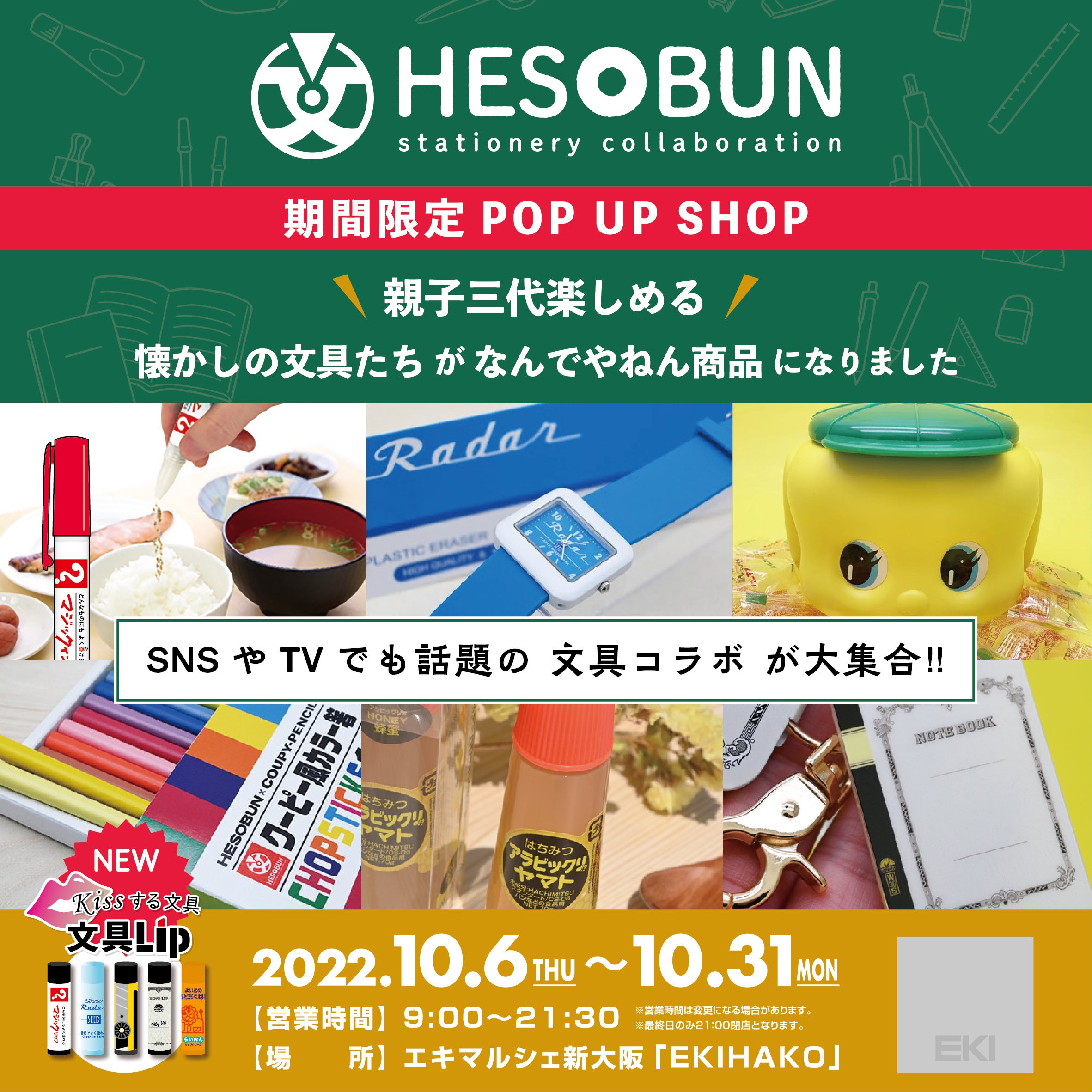 マジックインキ、フエキ糊、Radar、よいこのおどうぐばこ、ツバメノート、アラビックヤマトなど、有名文具メーカーとのコラボにより新しい角度で文房具の楽しさを伝える「なるへそ!」な文具、「へそ文-HESOBUN-」のポップアップショップが、エキマルシェ新大阪 「EKIHAKO」に期間限定オープン!有名文具メーカーとのコラボ商品をはじめ、使う人が「なるへそ!」を体感できる話題のアイテムたちが大集合!雑貨やふりかけ、お菓子など、楽しいグッズを取り揃えて皆様のお越しをお待ちしております。