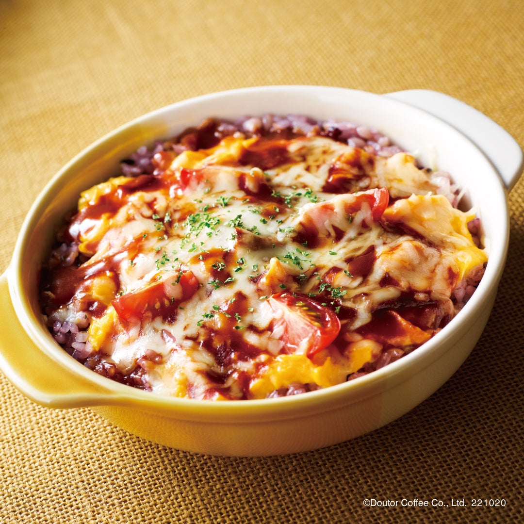国産のコシヒカリに黒米やもち麦などを混ぜ込んだ雑穀ごはんの上にスクランブルエッグを敷き、その上からデミグラスソースをかけミニトマト、シュレッドチーズ、パセリをトッピングしました。ふわとろ食感のたまごと香り豊かなデミグラスソースを混ぜながら食べることで、濃厚で深みのある味わいをお楽しみいただける一品です。