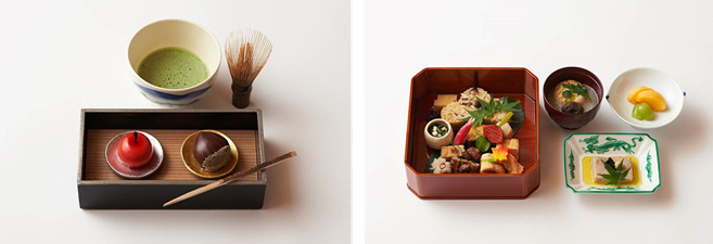 楠本シェフ監修のもと、「菓子工房ルーヴ」と「夢菓房たから」がコラボレーションして創出したヴィーガンスイーツ(※下写真左)と、「料亭二蝶」によるヴィーガン御膳(※下写真右)