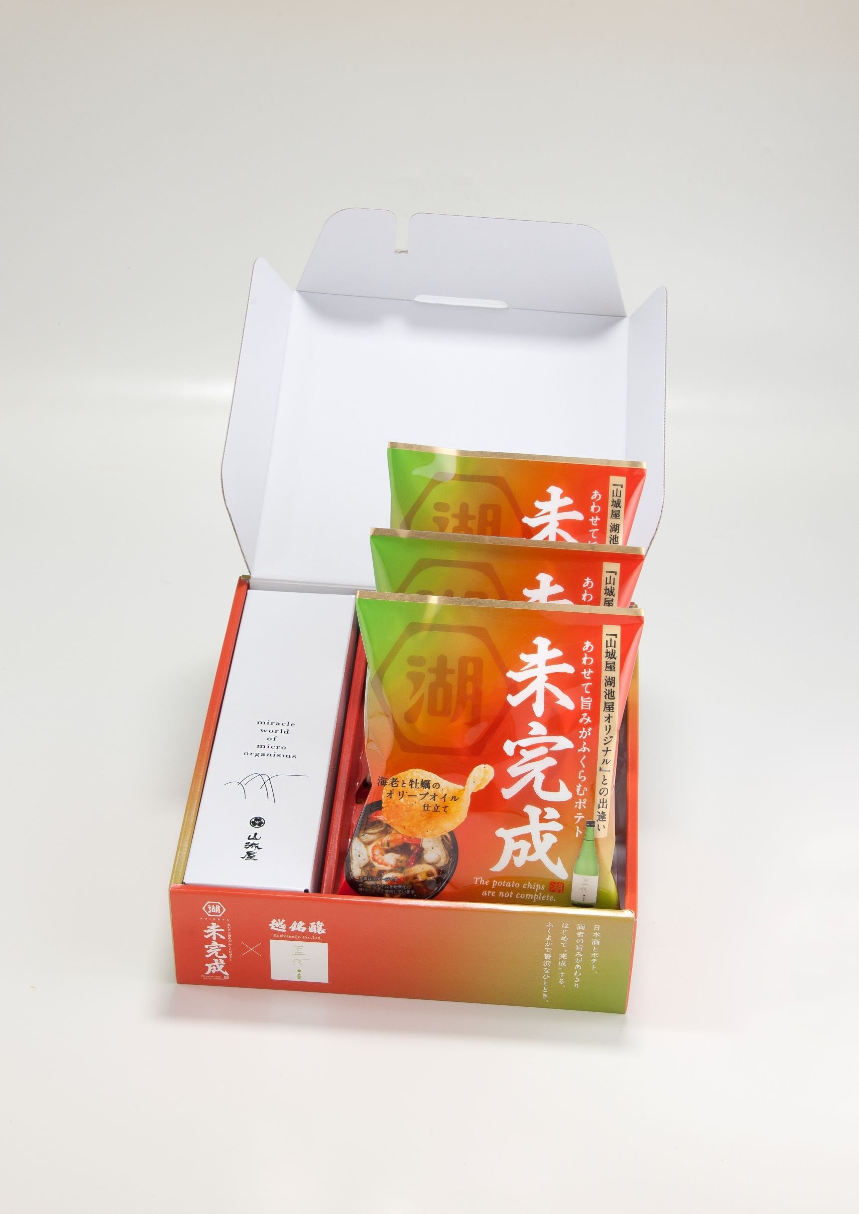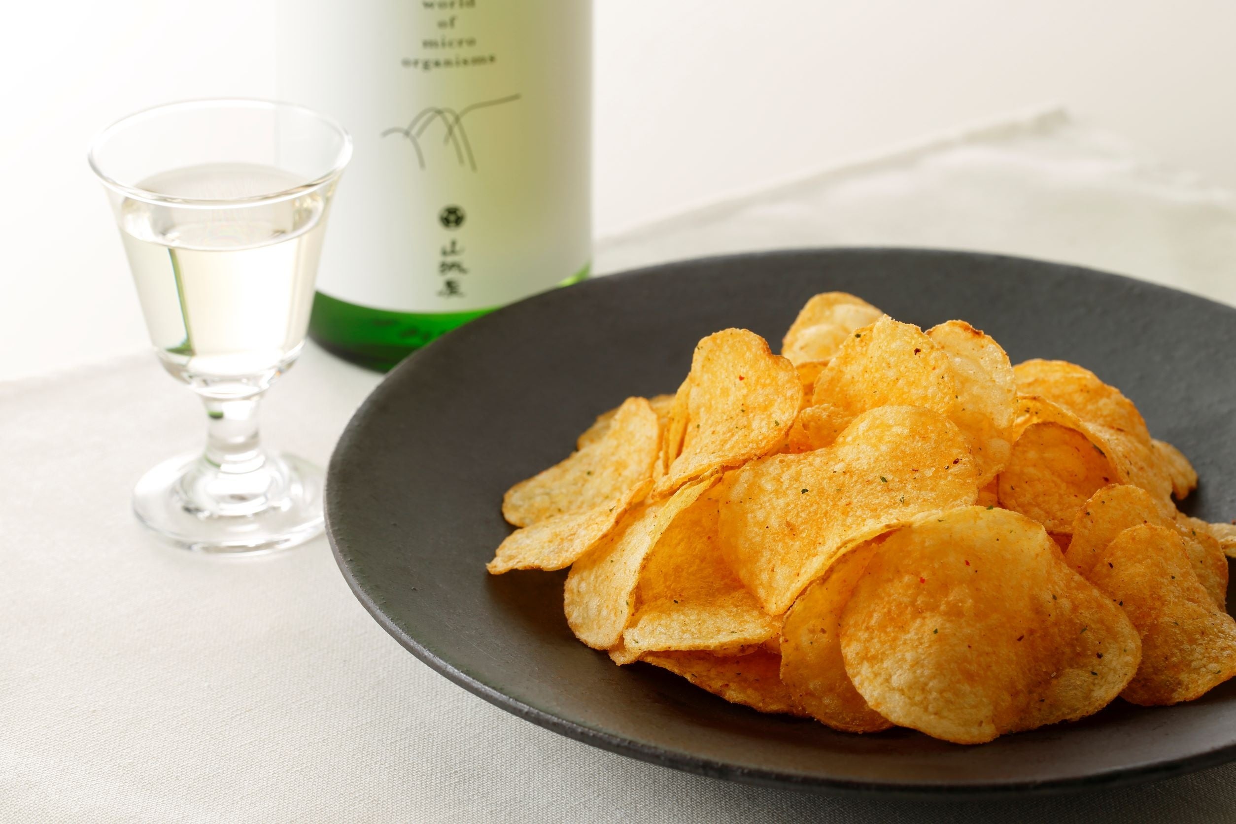 江⼾時代からの伝統を守った酒造りを貫く老舗酒蔵「越銘醸」と、⽇本初のポテトチップス量産化を実現した⽼舗菓子メーカー「湖池屋」。この2社が「原点回帰」の名のもとに共同開発した商品です。