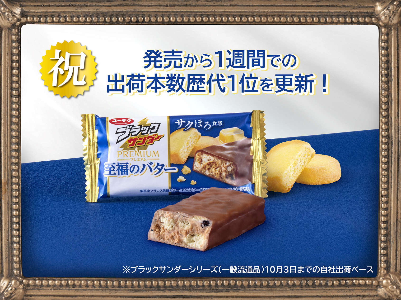 - 「ブラックサンダー至福のバター」が、発売から1週間での出荷本数465万本を突破し、同一期間内でブラックサンダーシリーズ品(一般流通品)で歴代1位(※)を更新!