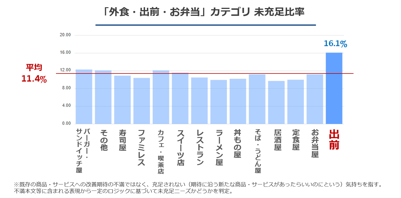 また、未充足不満が含まれる割合(未充足比率)に着目すると「外食・出前・お弁当」カテゴリの中で「出前」が最も多く未充足比率が高く、改善を求めるだけではない「もっとこうだったらいいのに」というユーザーの気持ちが含まれる不満が多いことが分かりました。