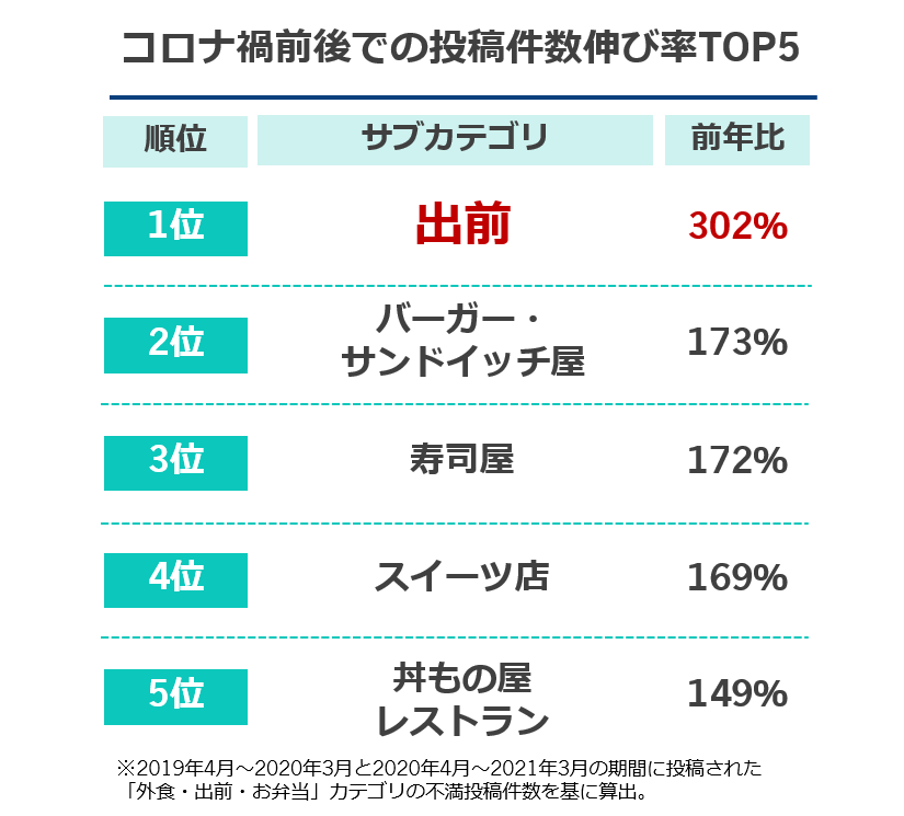 コロナ禍前後での不満投稿数の伸び率をカテゴリごとに比較すると、「出前」が302%で最も多く、利用者の増加によって急激に不満が増えていることが分かりました。