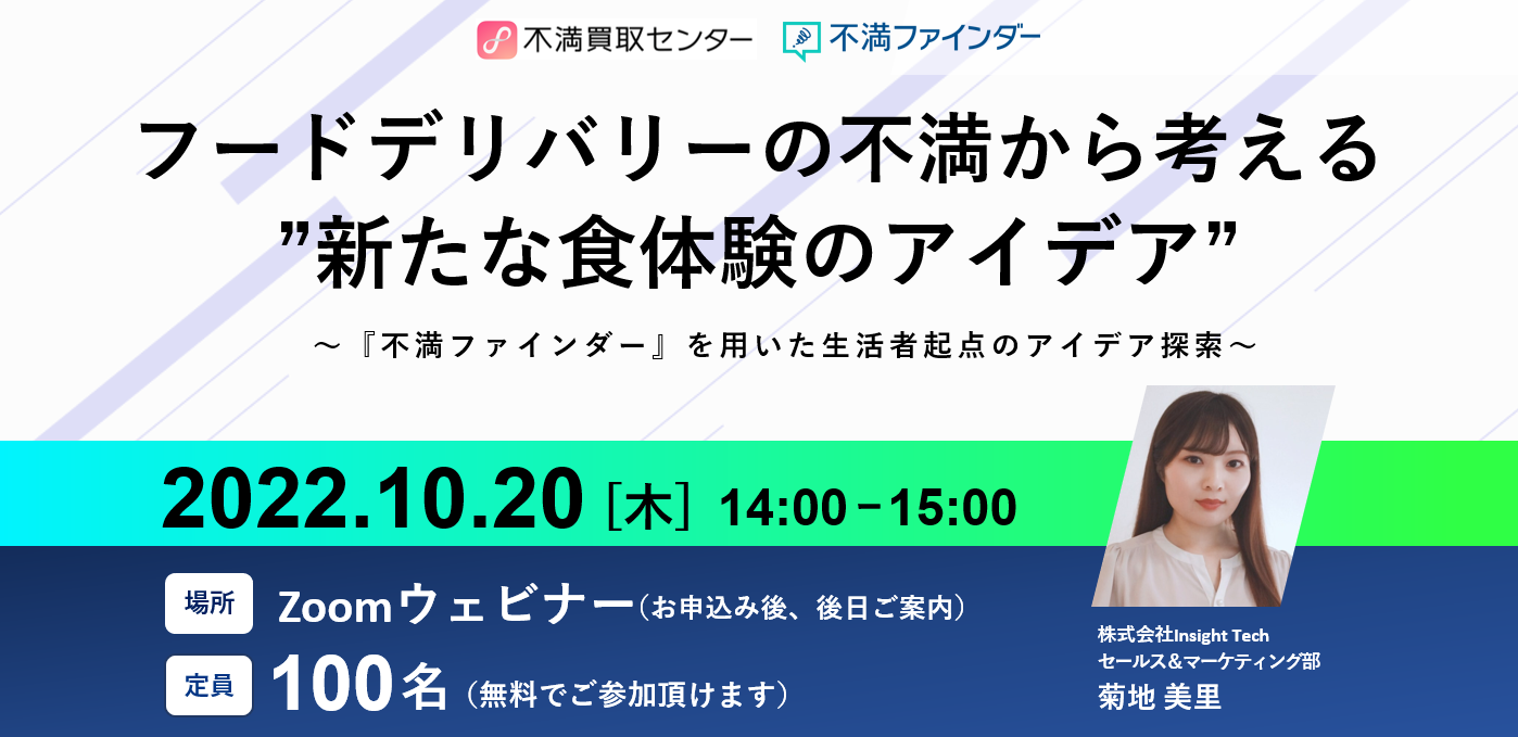 今回のウェビナーでは、コロナ禍前後での投稿件数伸び率1位・未充足意見を含む比率1位の「出前」不満に着目し、『不満ファインダー』を用いて不満の傾向を分析。テキスト解析により出前不満のトレンドワードを確認する他、弊社独自のフレームワーク”優先課題図”を用いて課題の優先度を明らかにしました。さらに、フードデリバリーの利用シーンに関する不満から、新たな食体験に繋がるアイデアをおまとめしています。急激に成長するフードデリバリーの不満から、N=1の声をどのようにビジネスアイデアに昇華させていくのか、そのプロセスをご一緒出来ればと思います。