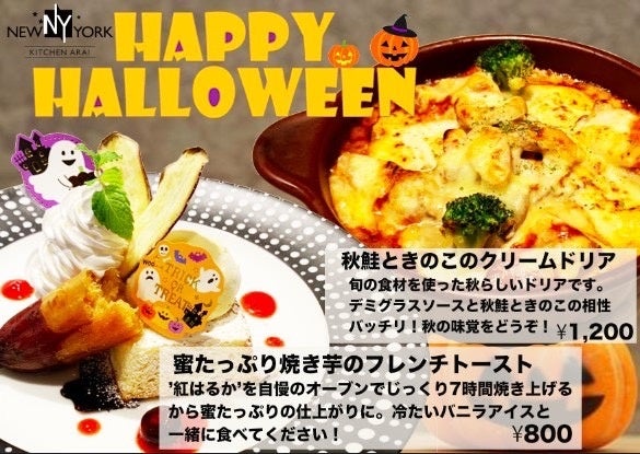 株式会社RAVIPA(代表取締役新井亨 東京都豊島区)の運営するNew York Kitchen ARAI(ニューヨークキッチンアライ リーフウォーク稲沢店でハロウィンイベントをスタート!食欲の秋にぴったりの紅はるかを使ったフレンチトーストや秋鮭のクリームドリアがお楽しみいただけます。10月31日までの期間限定開催になりますのでお早めにご来店ください。