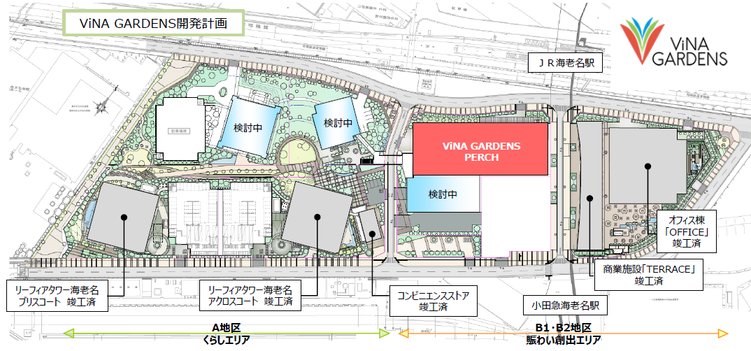 本施設が位置する開発エリア「ViNA GARDENS」は、「憩う・くらす・育む」をコンセプトに、2015年から開発を進めています。本開業により、海老名に新しい魅力が付加されることで、くらしの充足を実感いただき、海老名を“より住みたい・住み続けたいまち”にしていきます。