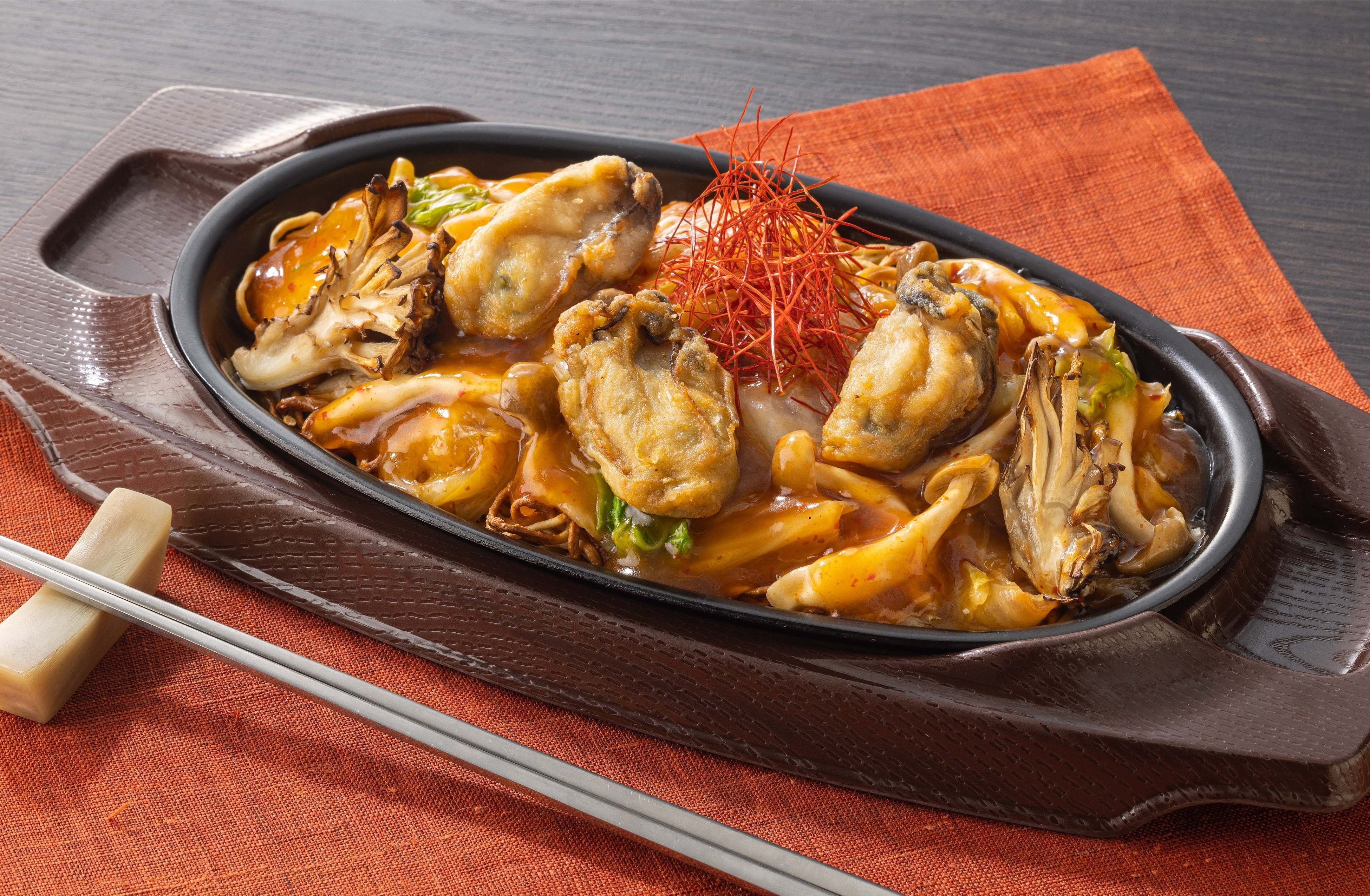 自家製の焼きそば麺をご注文毎に香ばしく焼き上げ、ぷりぷりの広島県産牡蠣と香り高い焼き舞茸をのせた上に、発酵食材でもあるキムチ入りのピリ辛あんをかけた韓国風のあんかけ焼きそばです。