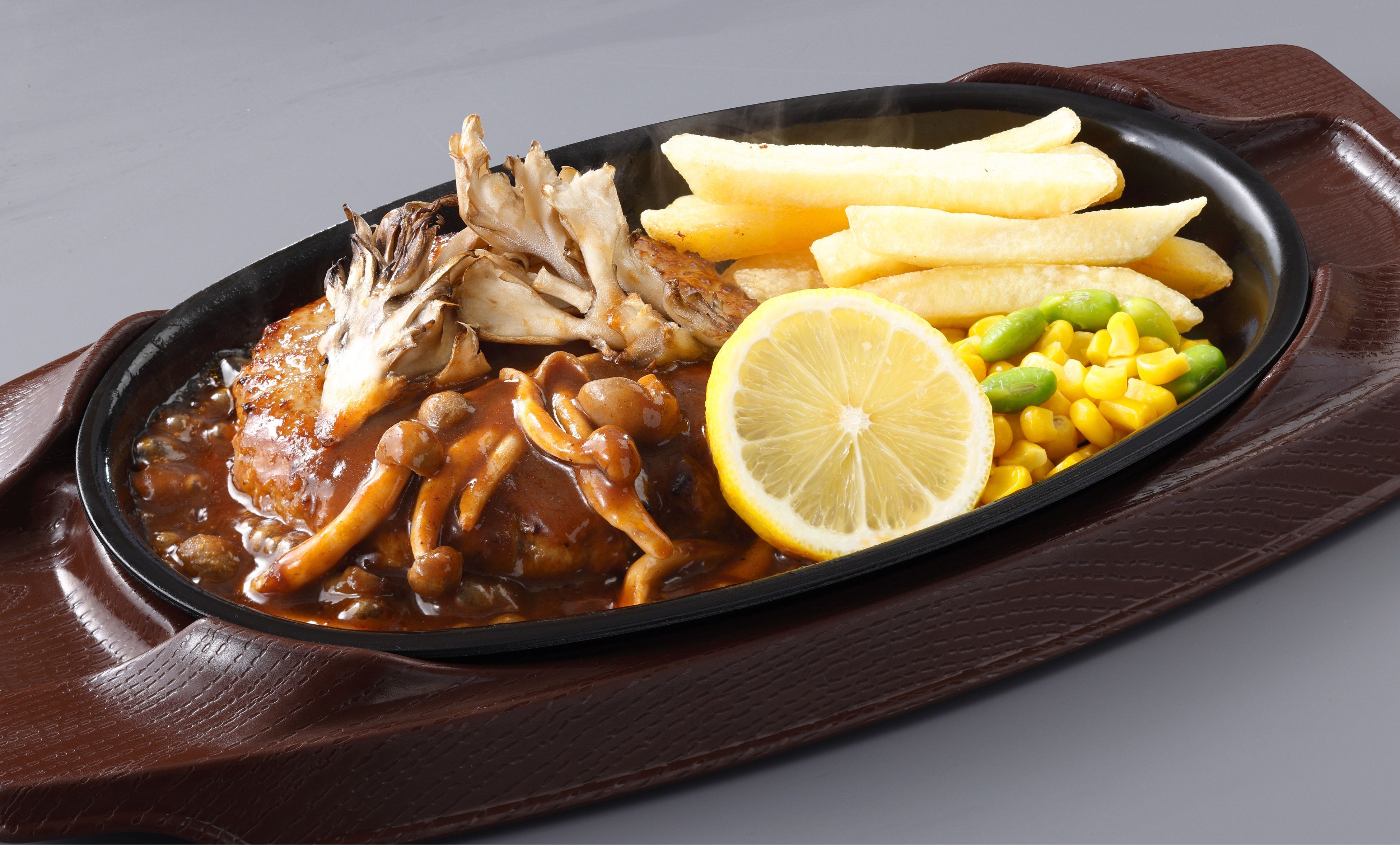 新「チーズINハンバーグ」に、香り高く香ばしいたっぷりのきのこと爽やかなレモンをあわせました。