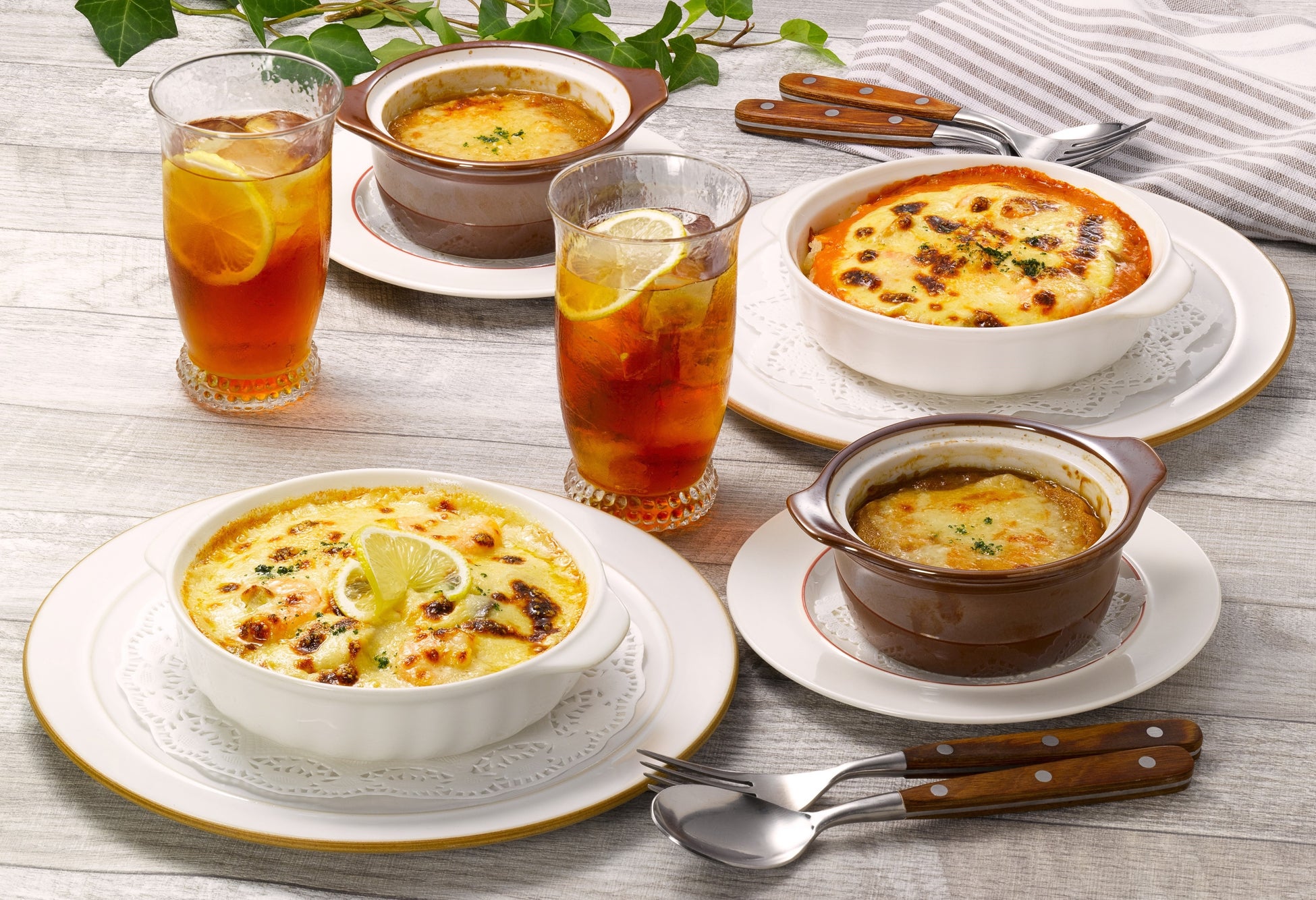 栗の甘さを感じるごちそうコスモドリアに、魚介香るごちそうシーフードドリアとオニオングラタンスープ2人分を詰め合わせたお試しセット。クルトンとグリュイエールチーズをフレンチオニオンスープにのせて、オーブントースターで焼き上げればオニオングラタンスープの完成。シェアしても楽しい2種のごちそうドリアと、身体だけでなく心も満たしてくれる、どこかほっとする優しい味わいのスープで、豊かなひとときをお過ごしください。