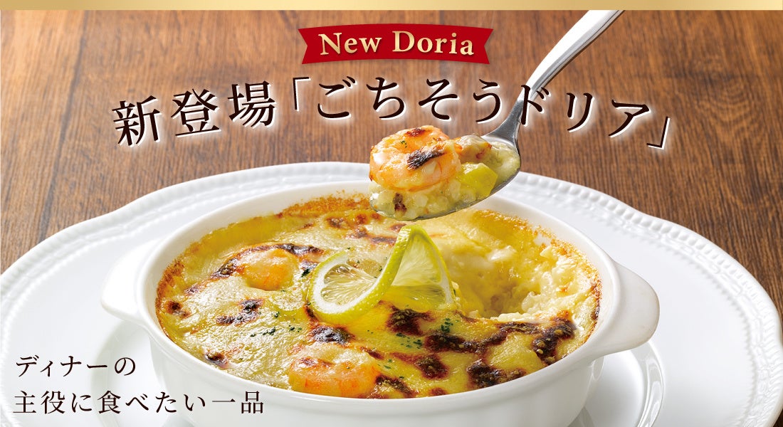鶏肉の旨みが溶け込んだコクのある特製ドリアソースに、ブラックタイガー海老や栗などを加え焼き上げた、ディナーの主役にぴったりのごちそうドリアです。