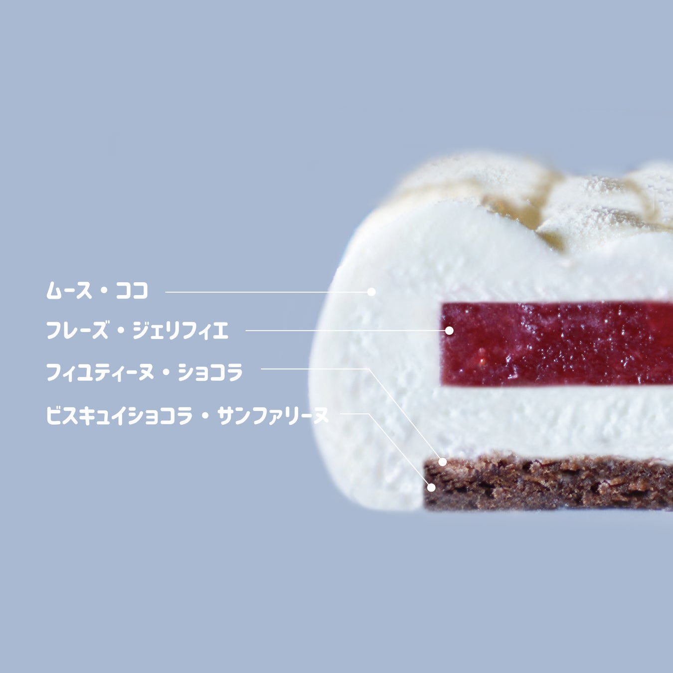 もこもこの雲の形をモチーフとした、シェフこだわりのムースケーキ3種はそれぞれキャラクターの名前に沿ったフレーバー構成となっており、柔らかな口溶けが評判です。