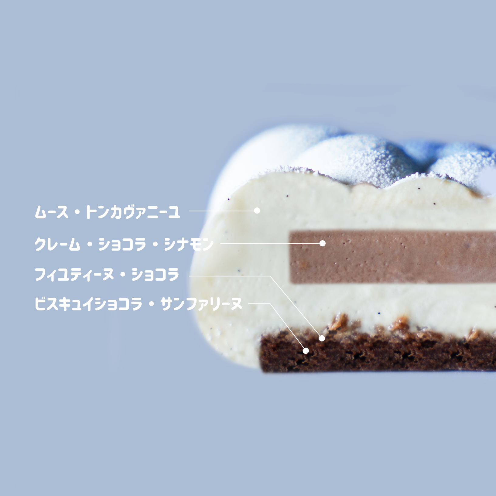 もこもこの雲の形をモチーフとした、シェフこだわりのムースケーキ3種はそれぞれキャラクターの名前に沿ったフレーバー構成となっており、柔らかな口溶けが評判です。