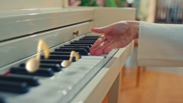 ご本人も「まだ撮影には慣れない」と仰っていたように、少し緊張した面持ちでしたが、いざ撮影が始まると一気にスイッチが入った様子。ブランドコンセプトにそった明るい表情に切り替わり、ファーストカットから早々に監督のOKが出ました。その後も、次々といろいろなカットの撮影を重ねていきます。カットの合間には、無邪気にピアノの鍵盤を叩くなど、徐々に撮影に馴染んでいる様子も見受けられました。途中、音が出ないトラブルが発生した際も、アドリブで音階を弾き当てるなど、スタッフをフォローする場面も。