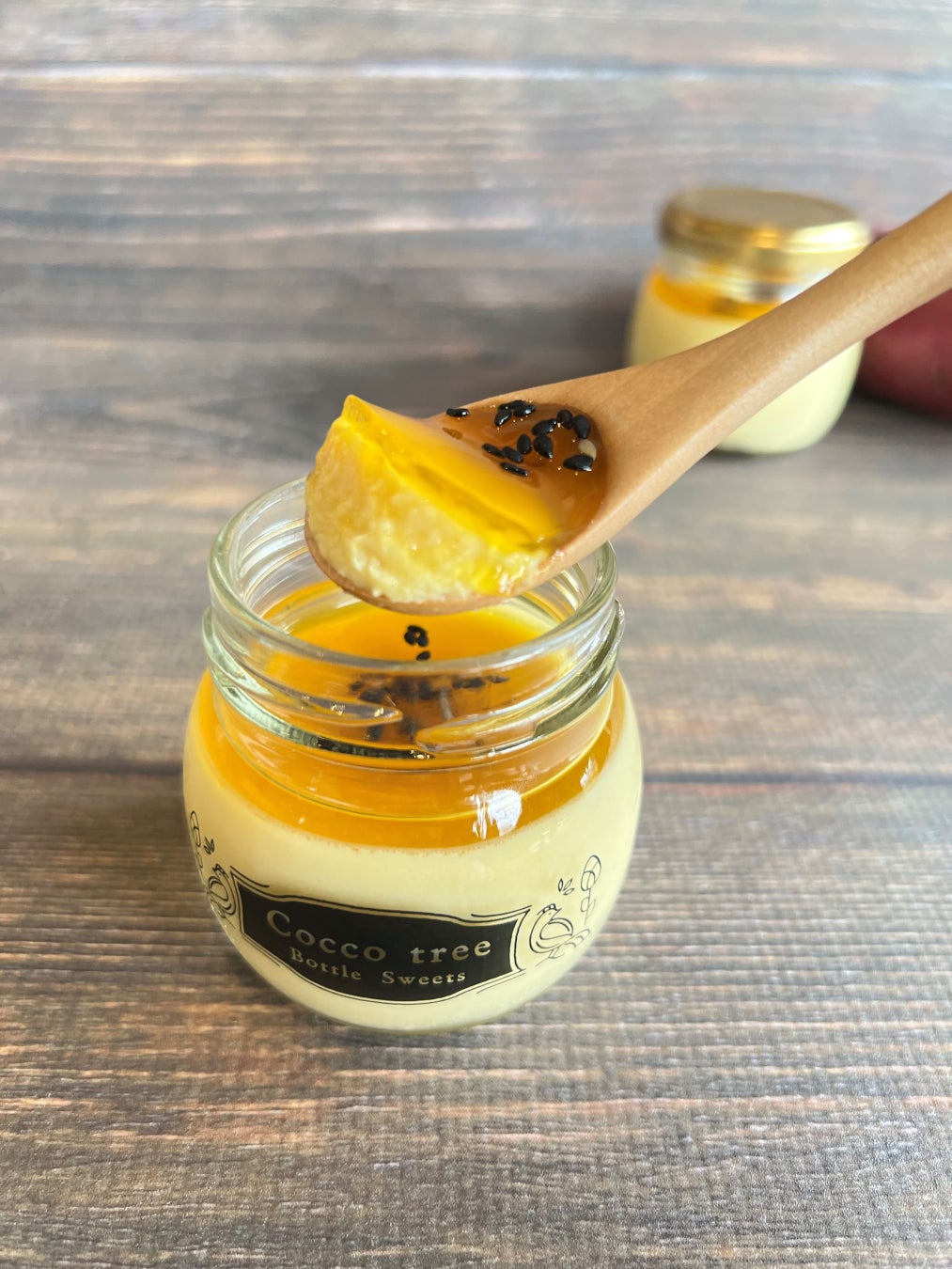 一番上には安納芋ソースをかけました。ぷりんとスイートポテトを掛け合わせたような新感覚のぷりんをどうぞお楽しみください。