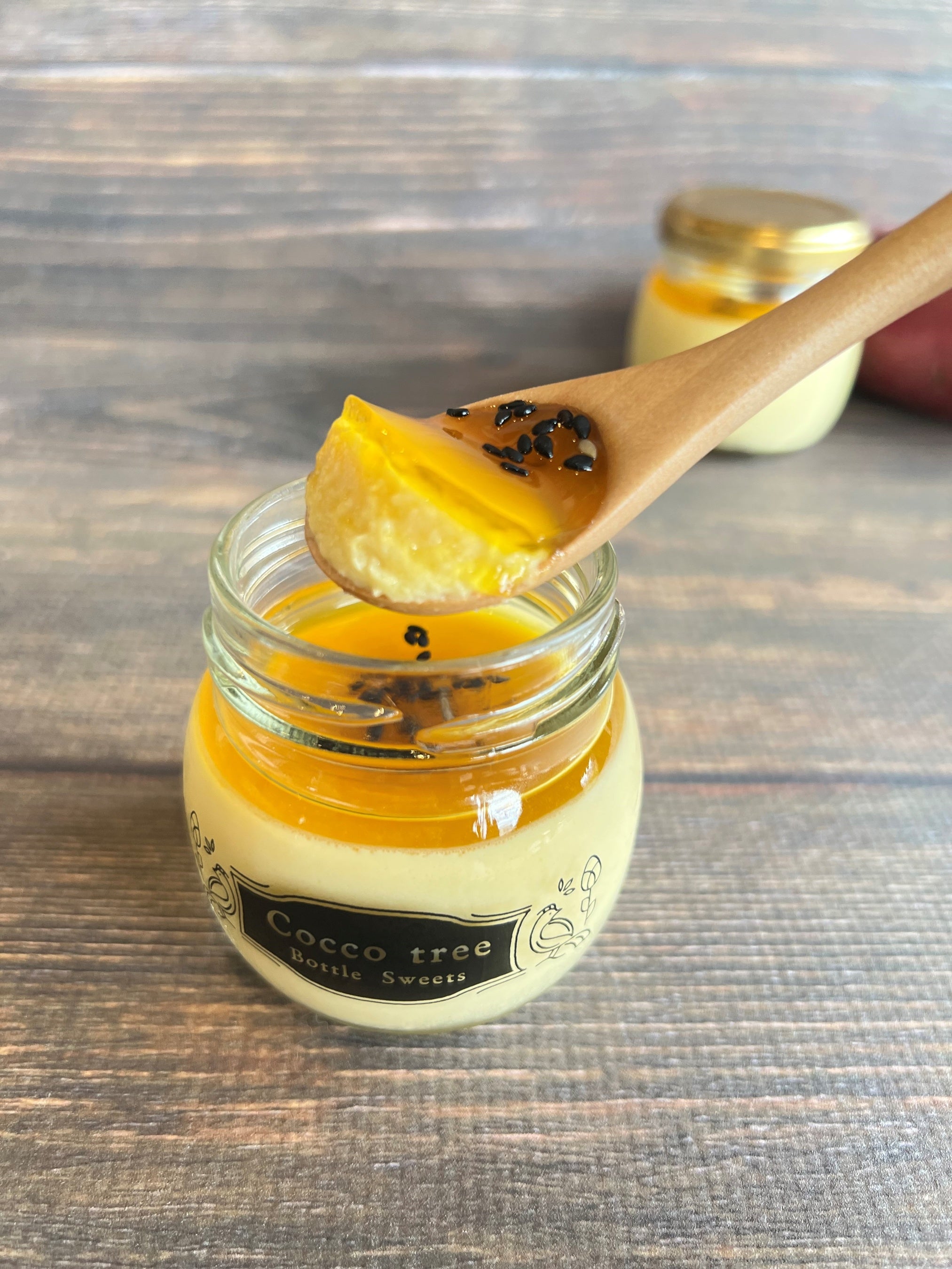 一番上には安納芋ソースをかけました。ぷりんとスイートポテトを掛け合わせたような新感覚のぷりんをどうぞお楽しみください。
