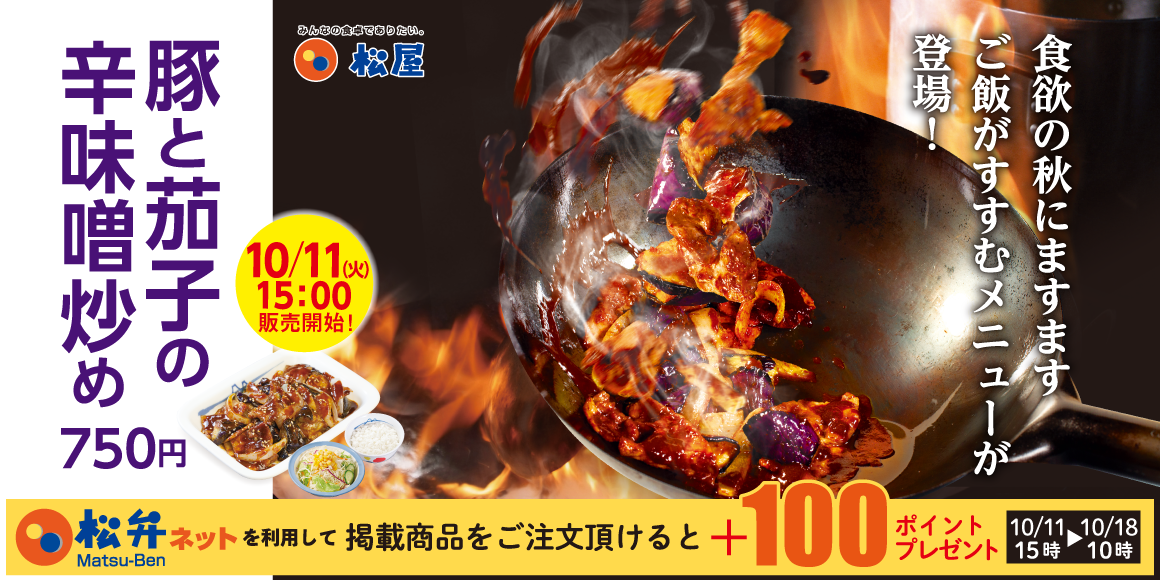 10月11日15時~10月18日10時まで、松弁ネットを利用して「豚と茄子の辛味噌炒め定食」をご注文頂けると、100ポイントプレゼントいたします。