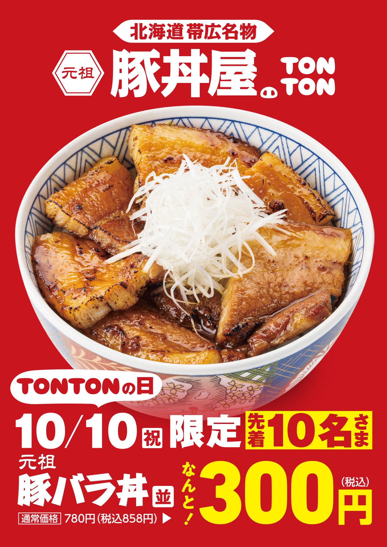 本場・北海道帯広の本場豚丼をボリュームたっぷりに味わえる「元祖豚丼屋TONTON 直江津店」では、10/10(祝)を「TONTONの日」として、人気の「元祖豚バラ丼【並】」を通常価格780円(税込858円)のところ、1日限定で先着10名様に特別価格300円(税込)で提供いたします。