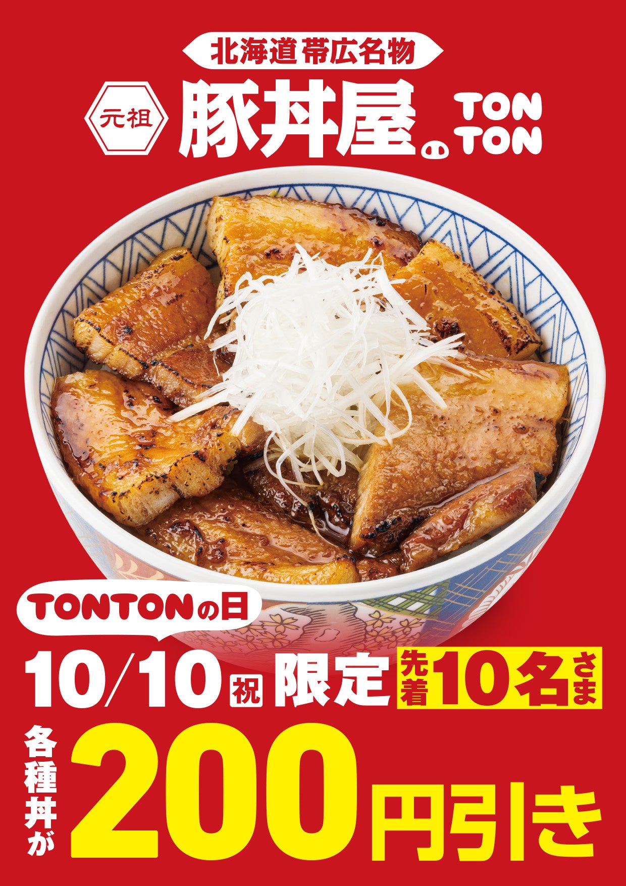 北海道・帯広豚丼が人気の「元祖豚丼屋TONTON 旗の台店」(住所:東京都品川区旗の台5-13-12、TEL:03-3787-8061)では、10/10(祝)を「TONTONの日」としてスペシャルイベントを実施いたします。