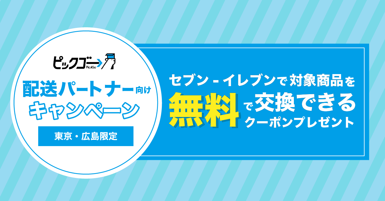 本キャンペーンは、「PickGo」に登録する配送パートナーが、東京都・広島県を集荷先とするセブン-イレブンの案件を、5回運行完了ごとに1クーポンを獲得し、対象の商品を無料で交換できるキャンペーンです。