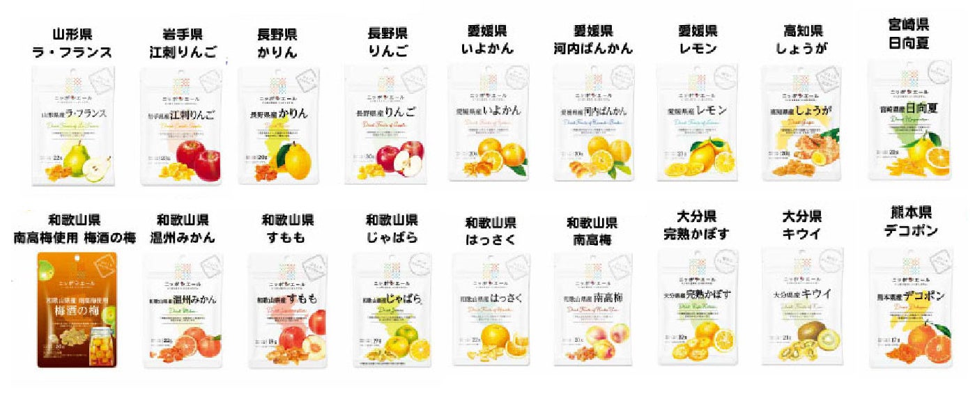 全農ブランド「ニッポンエール」から、果物のおいしさをそのまま閉じ込めた、フルーツ王国ニッポンの果実を楽しめるドライフルーツです。 輪切りやひとくちサイズ、ピールなど果実によって形状もさまざまで、食感の違いも楽しめます。便利な食べきりサイズなので、組み合わせやアレンジも楽しめます。