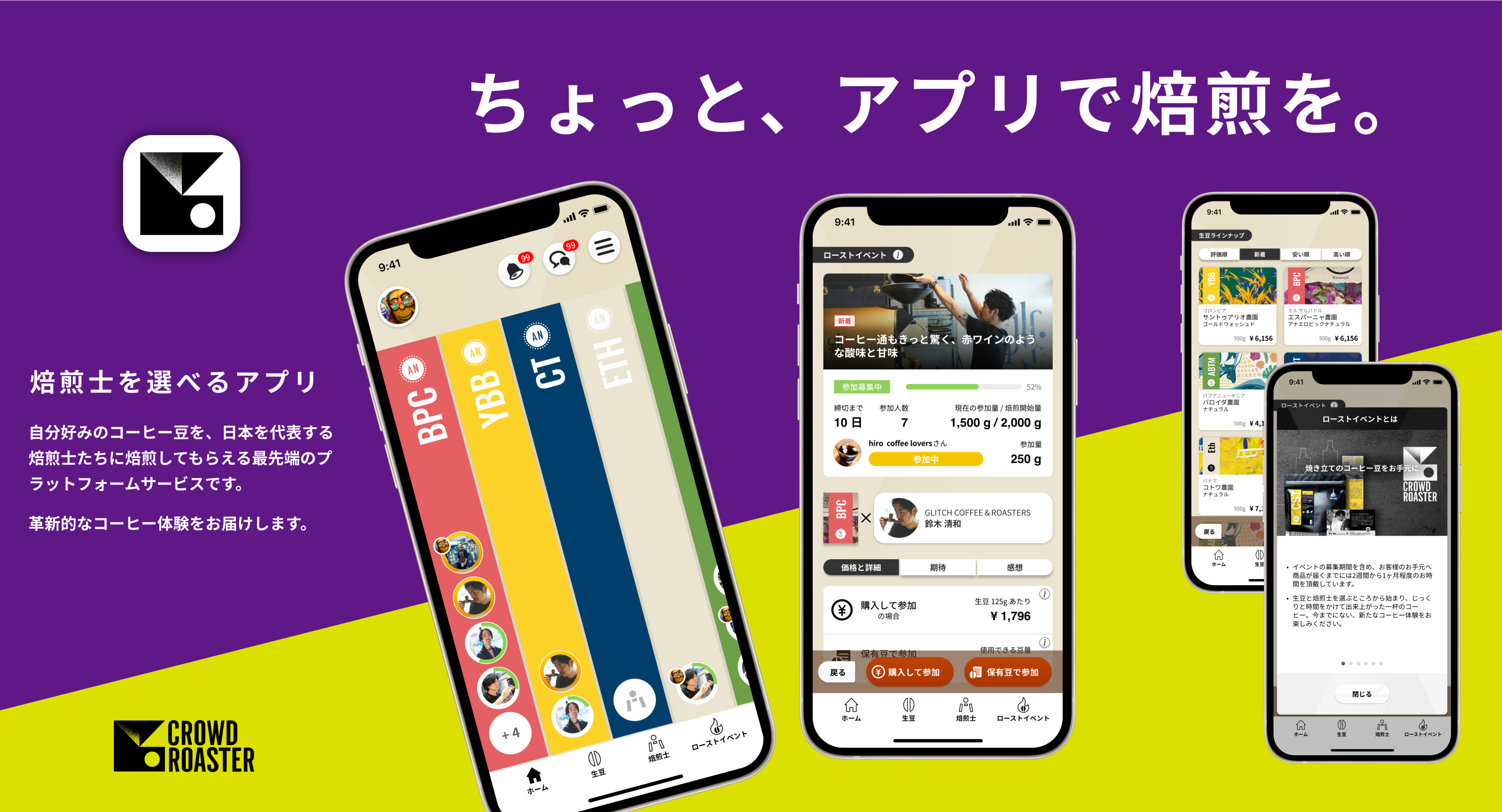 CROWD ROASTERは、日本を代表する焙煎士たちに、好みのコーヒー豆を個人が直接、焙煎依頼をすることができる唯一のアプリ。焙煎士や商社、生産者を含むコーヒープロフェッショナルと、熱狂的なコーヒーラバーズとをつなぎ、新しいコーヒー体験を楽しむコミュニティとしてもユーザーからの支持を得ています。