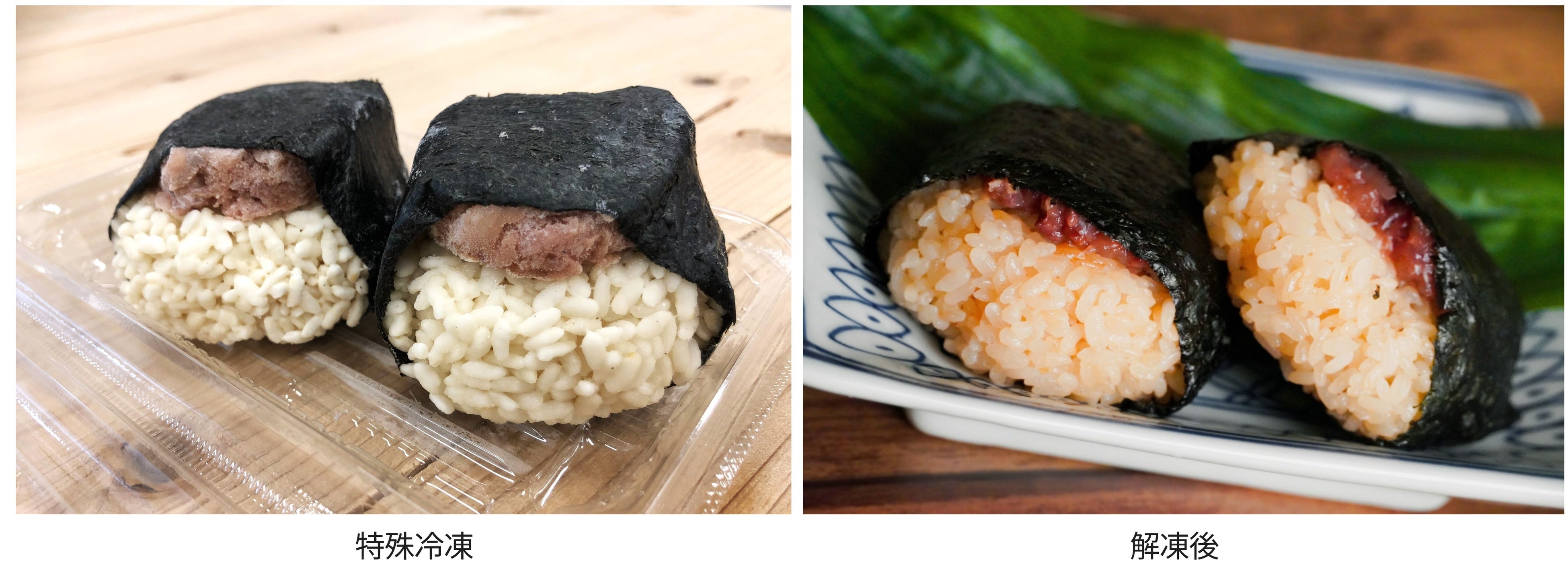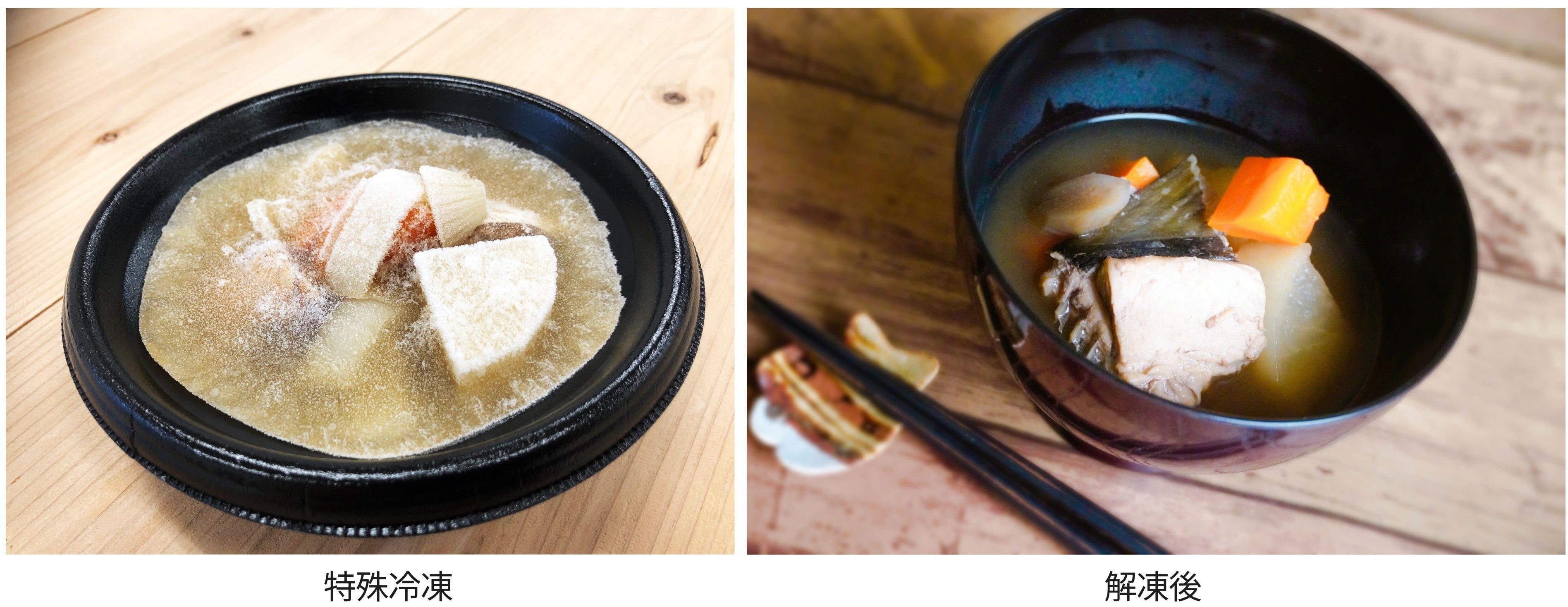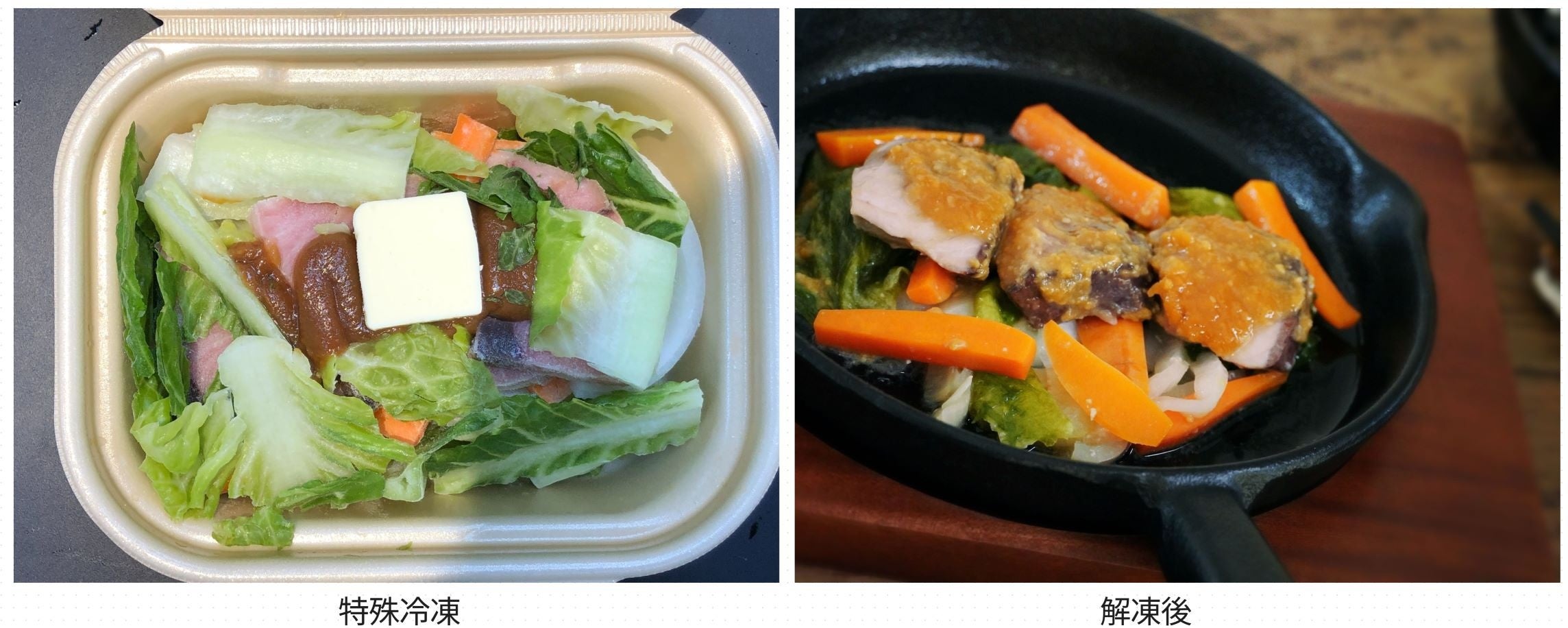 急速冷凍に凍結媒体ごとの特殊な技術を踏襲することで、さらに高品質な冷凍を実現する技術です。一般的な冷凍の場合、細胞内の水分が氷に変わる温度帯(氷結晶生成温度帯:0℃~-5℃)の通過時に、 氷結晶が大きく歪になることで細胞が損傷。一方急速冷凍は、急速かつ均一に冷却することで氷結晶が小さく生成され、細胞の損傷を極少化でき、うまみ成分の流出を防ぎます。さらに特殊冷凍では、冷風の湿度や冷風の当て方などの特殊技術が加わり、形状維持や調理済みのあたたかい食品の急速冷凍を実現。これまで困難とされていた食材の急速冷凍を可能にするとともに、従来を上回る高品質な冷凍食材を生み出します。