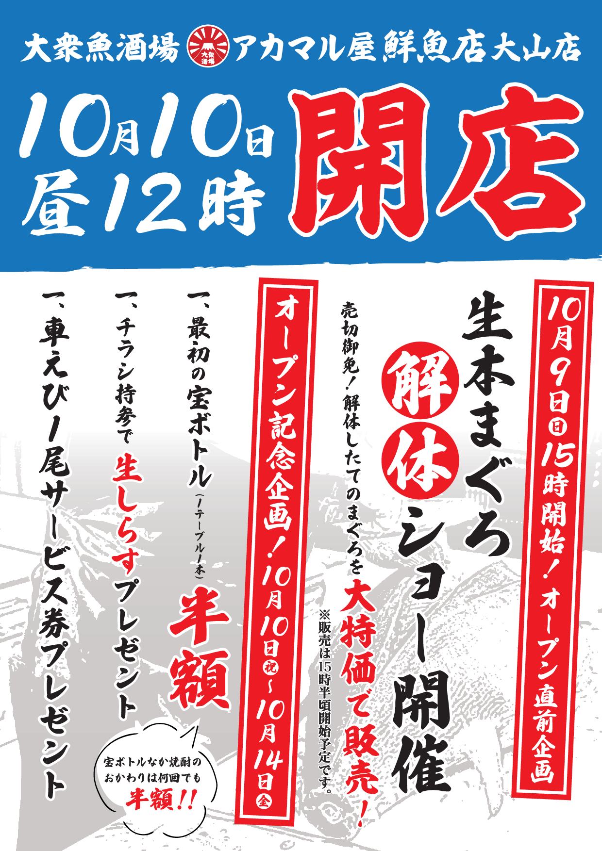 株式会社SANKO MARKETING FOODS(本社:東京都中央区、代表取締役:長澤成博、証券コード:2762、以下「当社」といいます。)は、鮮魚店と大衆酒場を併設したブランド『アカマル屋鮮魚店』を2022年10月10日(金)にグランドオープンし、前日の2022年10月9日(日)にOPEN企画として生本まぐろの解体ショーと即売会を実施いたします。