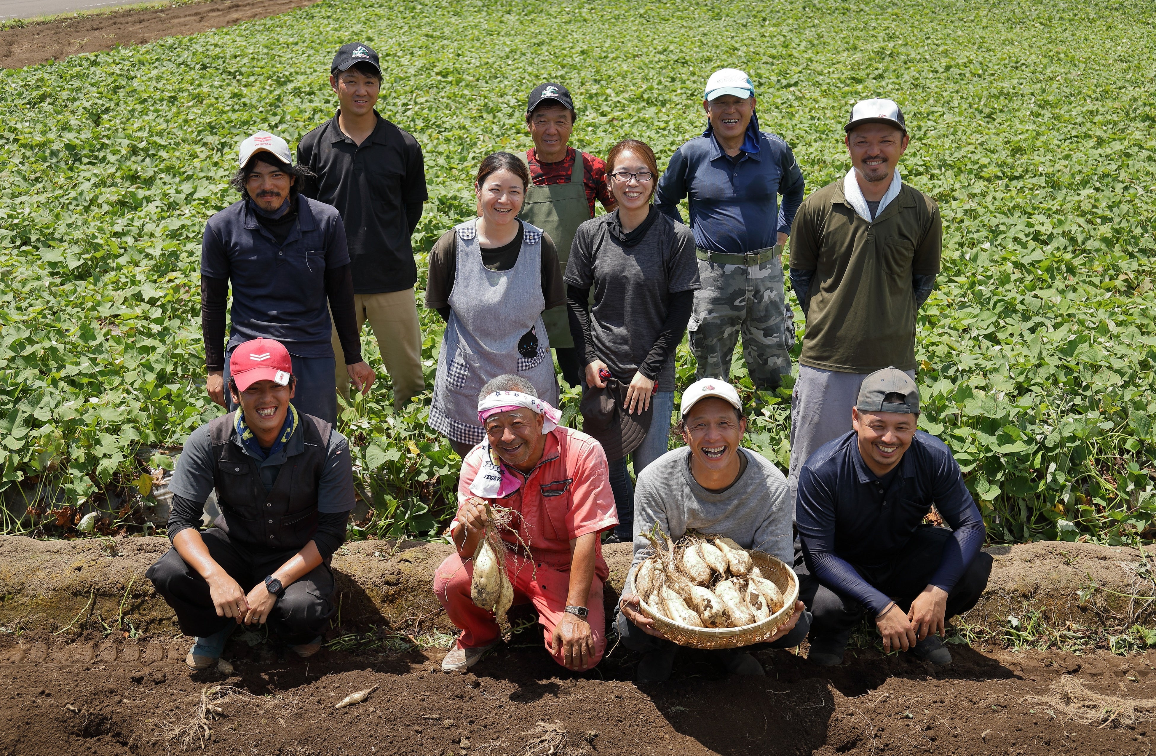 全国へ急速に広がっているサツマイモ基腐病。南九州の契約農家さんの中でも発⽣が確認されています。無病健全苗を使⽤したり、早期の掘り取りを⾏うなど、これまでと違う対応が求められており、農家さんにも協⼒して頂き、感染した⽣芋が⼊荷されないように取り組んでいます。また、これからも良いサツマイモを作っていけるように、「⼤地づくり」の取り組みも始めています。より⼟を元気にすることを⽬指し、⾃社農場はもちろん、契約農家さんでも、ごぼうや落花⽣・じゃがいもなどの「輪作」を⾏っています。サツマイモではない作物を作ることで、偏った圃場とならないように輪作体系を構築し、それぞれの作物を作る上で必要な作業も、最終的にはサツマイモ栽培につながります。栽培した作物は、芋屋⾦次郎での商品化を⾏い販売しています。
