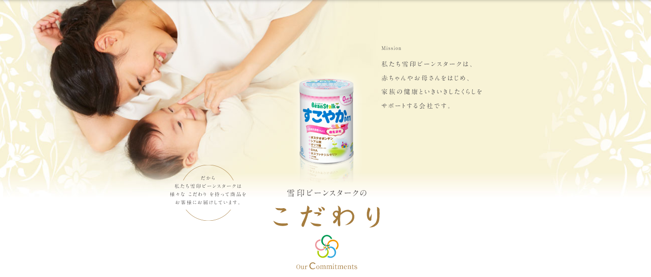 雪印ビーンスタークの商品やサービスを安心してご利用いただきたいという思いをこめて、育児用ミルクをはじめたとした育児用品や、妊娠期・授乳期の女性向けの商品ならびにサービスの提供において大切にしている「こだわり(comittment)」を知っていただくために開設したコンテンツです。