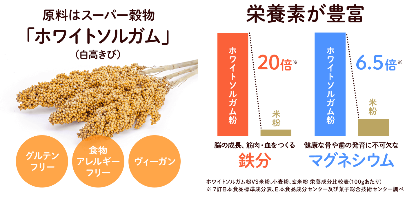 グルテンフリー、食物アレルギーフリー、ヴィーガンの食品として話題のスーパー穀物「ホワイトソルガム」は、アメリカでとうもろこし、大豆、小麦に続く『第4の穀物』として話題を集めています。雑穀特有の苦味、えぐみがなく、ほとんど無味無臭で食べ易く、鉄分や食物繊維、ミネラル、難消化性でんぷん(レジスタントスターチ)等の優れた栄養成分が含まれており、 日本でも小さな子どもがいるご家庭や保育の現場にも広く活用することができます。
