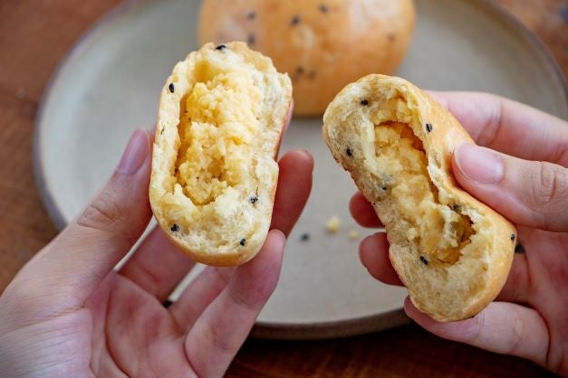 蜜芋フロマージュ・ブールは蜜芋の食感とクリームチーズのなめらかさ、両方の良さを活かすことがポイントでした。生地にはさつまいものペーストを練り込み、もっちりとした食感に仕上げています。