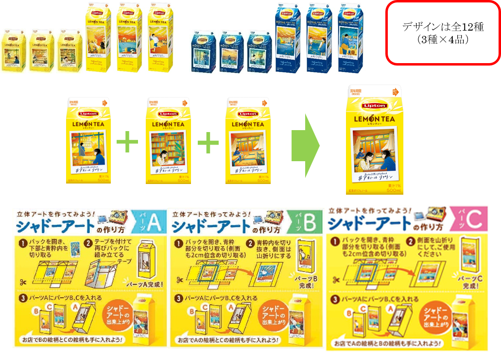 11月1日の「紅茶の日」に合わせて、シャドーアートパッケージの「リプトンレモンティー(500ml/1000ml)」「リプトンロイヤルミルクティー(500ml/1000ml)」を10月14日(金)以降順次、沖縄を除く全国にて期間限定で発売いたします。各品3種類の対象パッケージを組み合わせると、立体のシャドーアートが完成いたします。パッケージは「学生時代・青春時代に飲んでいた」というお声も多くいただいているリプトン紙パックのイメージに合わせて、「#アオハルリプトン」をテーマにした“エモい”レトロ感のあるデザインに仕上げました。学生の頃に飲んでいた方も、今学生の方も“エモい”シャドーアートをお楽しみください。