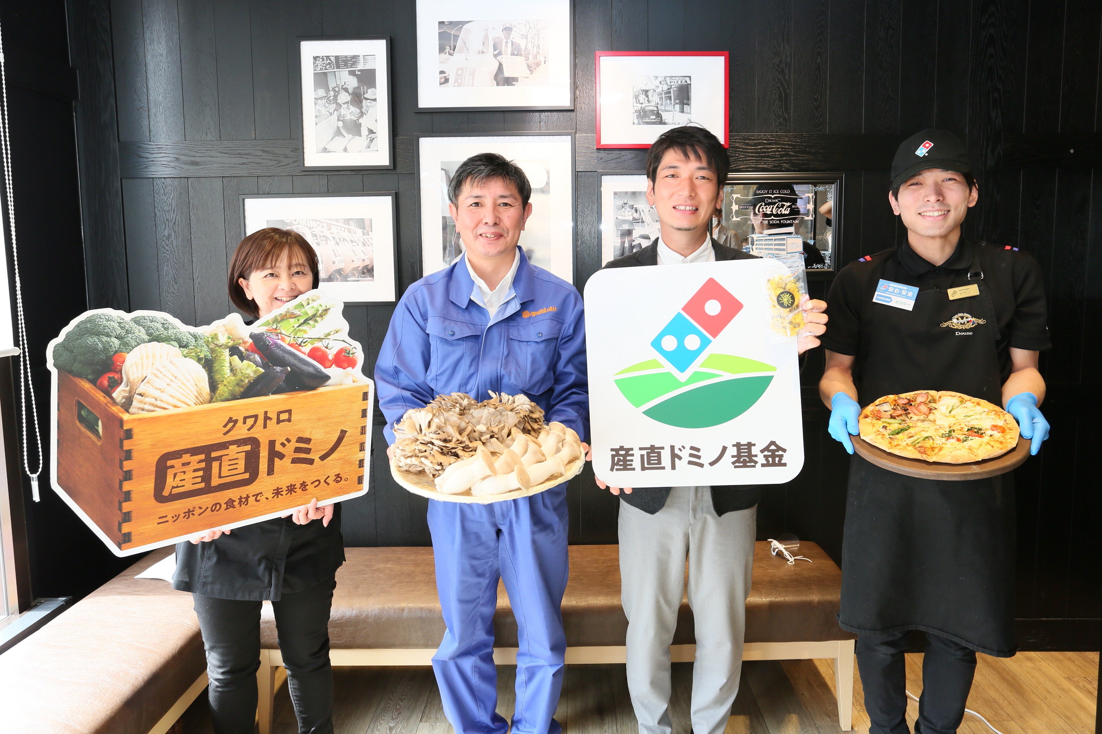 10月11日(火)には、本商品の発売を記念して、きのこの産地である新潟県内のドミノ・ピザ 新潟新和店にて、生産者の方とともに地元食材の魅力を全国に発信する「発売記念発表会」を開催いたしました。さらに、産直ドミノ基金の助成先である新潟で伝統食用菊の栽培復活に取り組む「りゅうのひげ会」にもお越しいただき、活動の進捗をご報告いただき、盛況のうちに終了しました。
