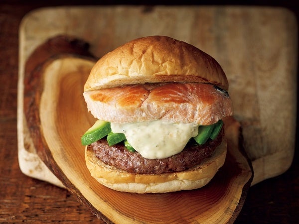 歯切れよく、さっくり軽い新麦「きたほなみ」を50%使用したバンズに秋鮭、アボカド、牛肉のパテをサンド。