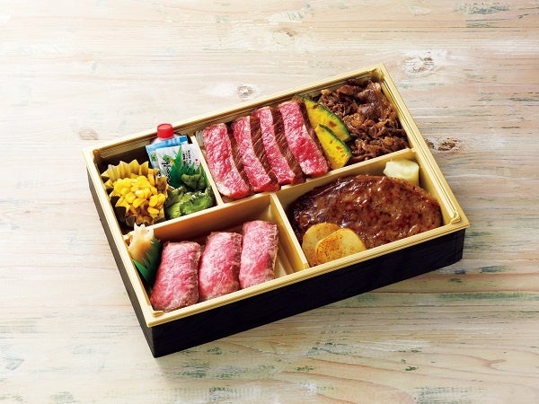 冷めてもおいしい新米「ななつぼし」は肉にも相性良し。カルビステーキ、サーロインの肉寿司など銘柄牛を味わう肉づくし弁当。